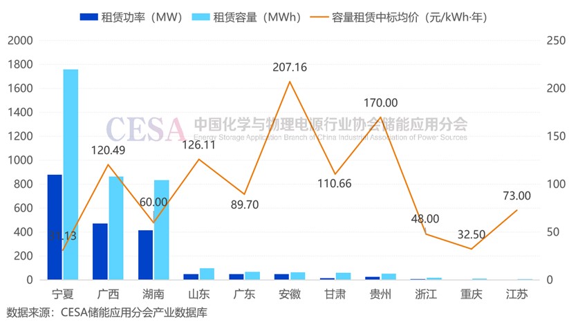 不同省份容量租賃價格差異巨大,容量租賃中標均價最低的省份是寧夏,加權(quán)均價為31.13元/kWh·年,中標單價主要集中在20-161.25元/kWh·年區(qū)間內(nèi)。