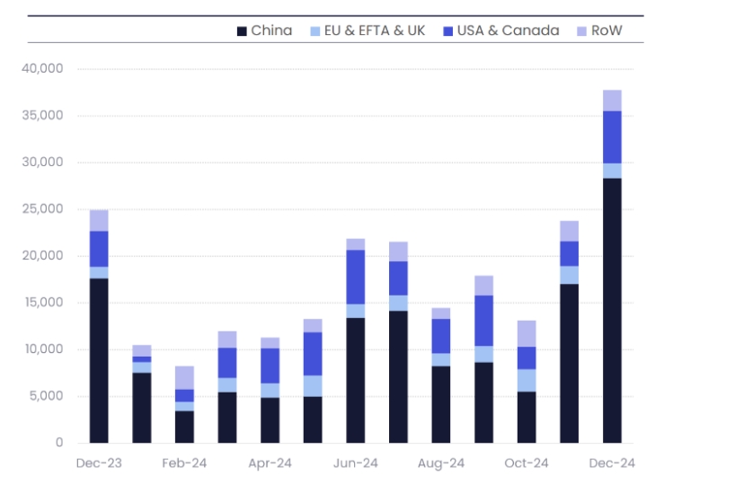 圖12024年全球各地每月部署的儲能系統(tǒng)(MW)