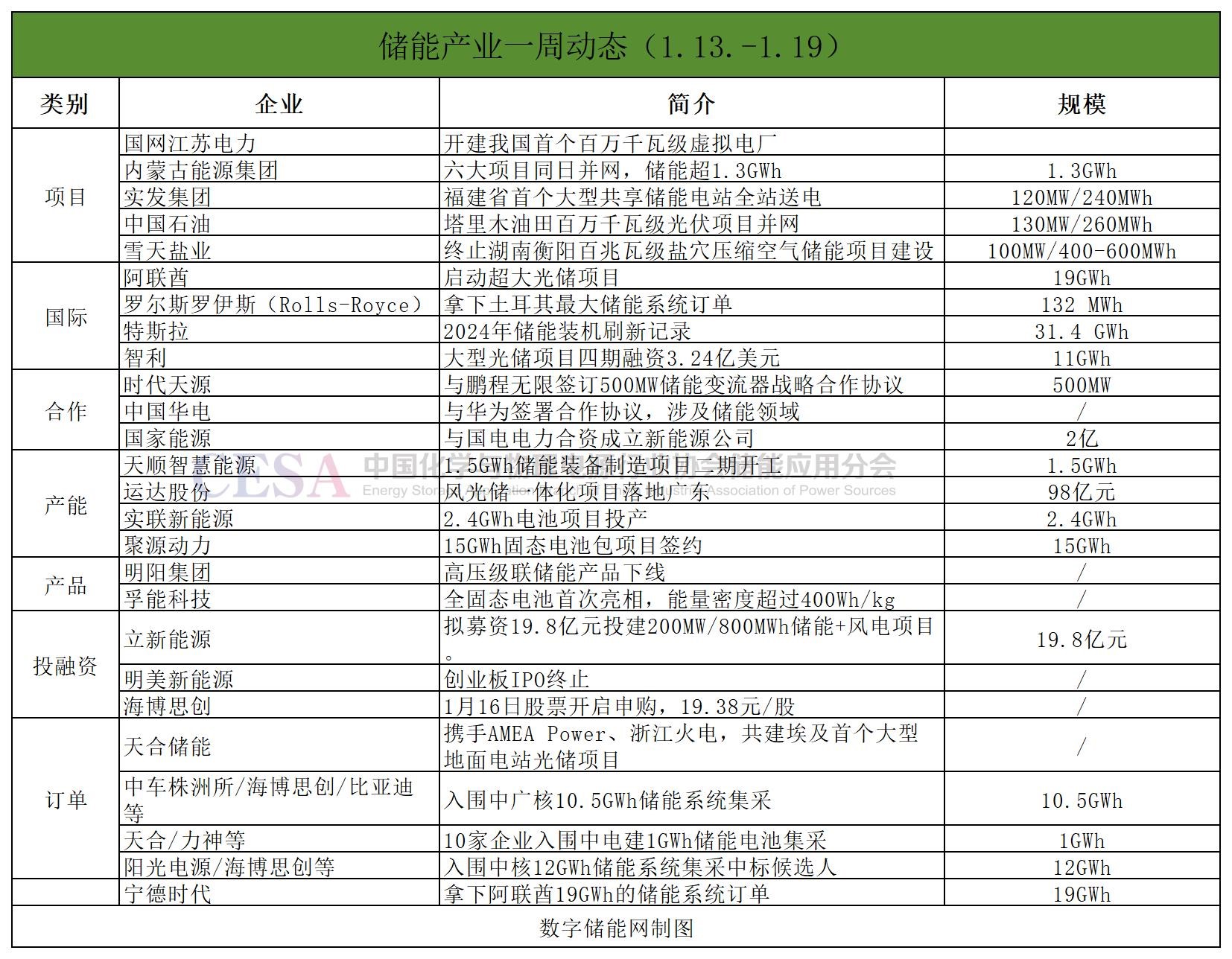 投融資方面,海博思創(chuàng)1月16日開啟申購,19.38元/股;立新能源擬募資19.8億元投建200MW/800MWh儲能+風(fēng)電項目;明美新能源創(chuàng)業(yè)板IPO終止。
