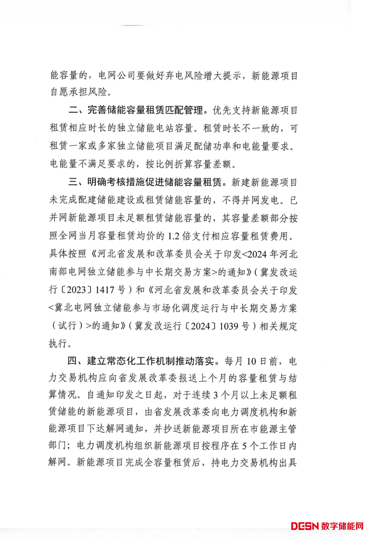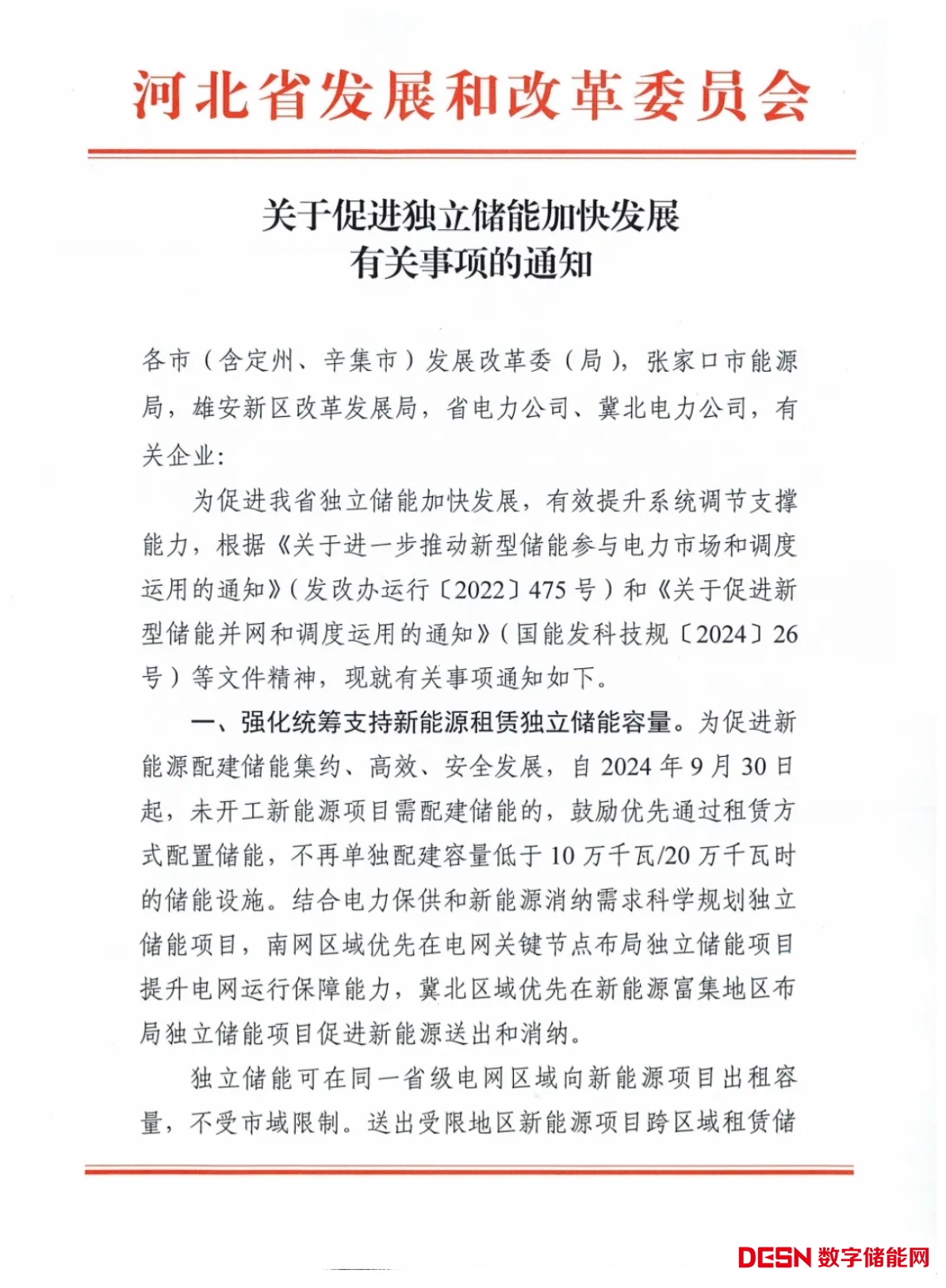 強化統(tǒng)籌支持新能源租賃獨立儲能容量。為促進新能源配建儲能集約、高效、安全發(fā)展,自2024年9月30日起,未開工新能源項目需配建儲能的,鼓勵優(yōu)先通過租賃方式配置儲能,不再單獨配建容量低于10萬千瓦/20萬千瓦時的儲能設施。