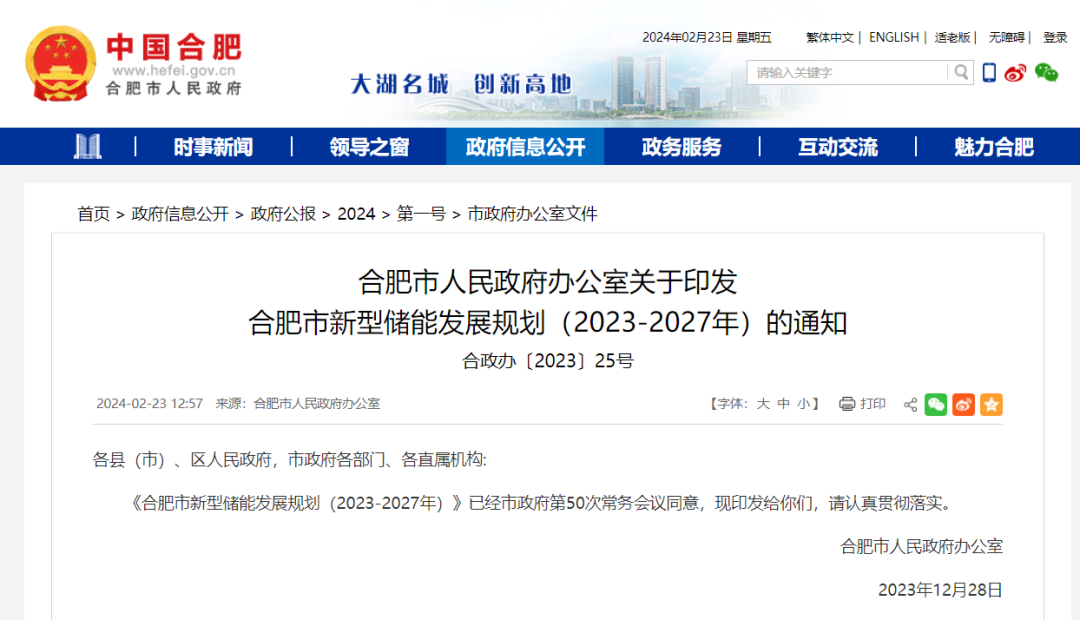 合肥市新型儲能發(fā)展規(guī)劃(2023-2027年)的通知