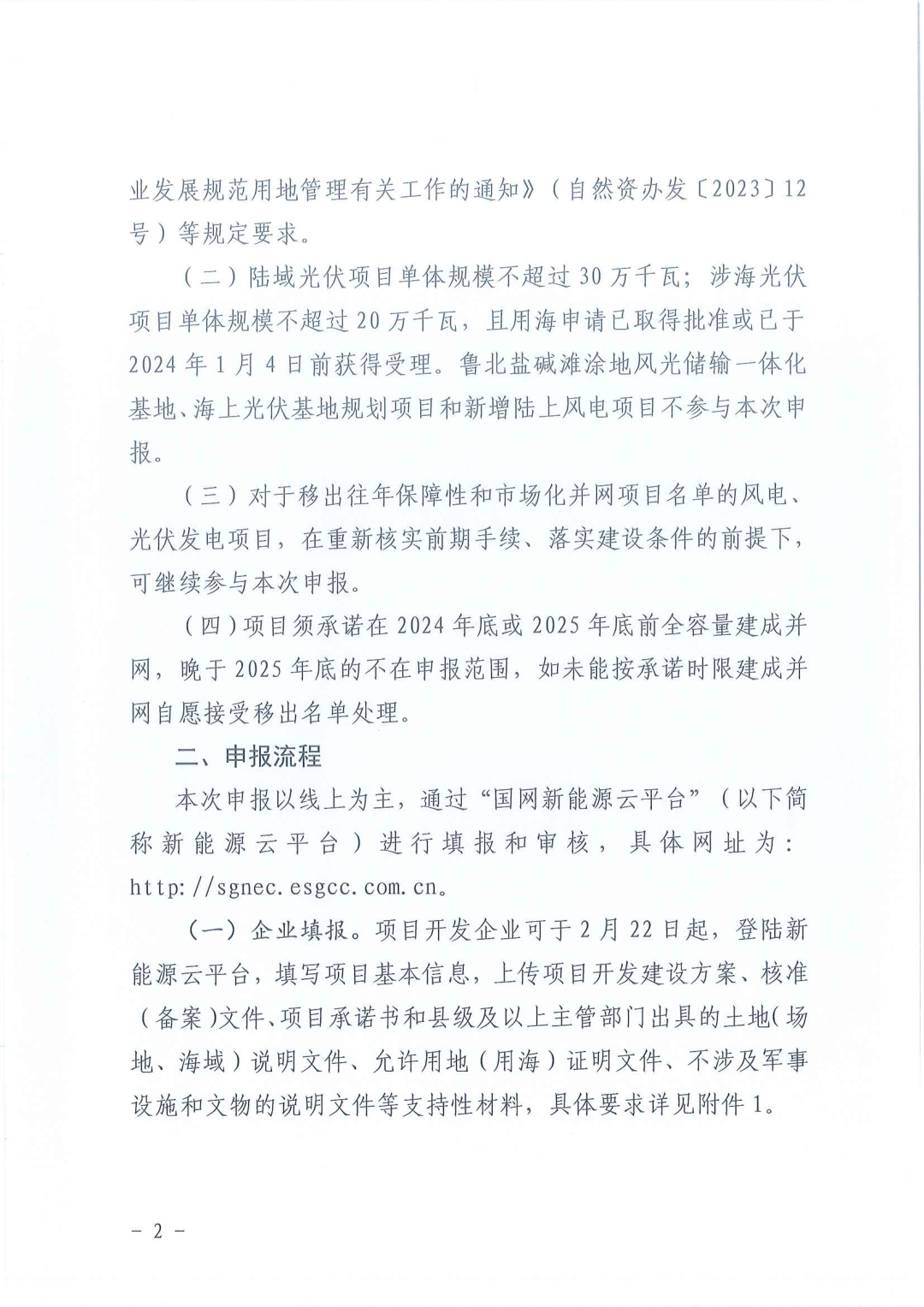 (二)陸域光伏項(xiàng)目單體規(guī)模不超過30萬千瓦;涉海光伏項(xiàng)目單體規(guī)模不超過20萬千瓦,且用海申請已取得批準(zhǔn)或已于2024年1月4日前獲得受理。魯北鹽堿灘涂地風(fēng)光儲(chǔ)輸一體化基地、海上光伏基地規(guī)劃項(xiàng)目和新增陸上風(fēng)電項(xiàng)目不參與本次申報(bào)。