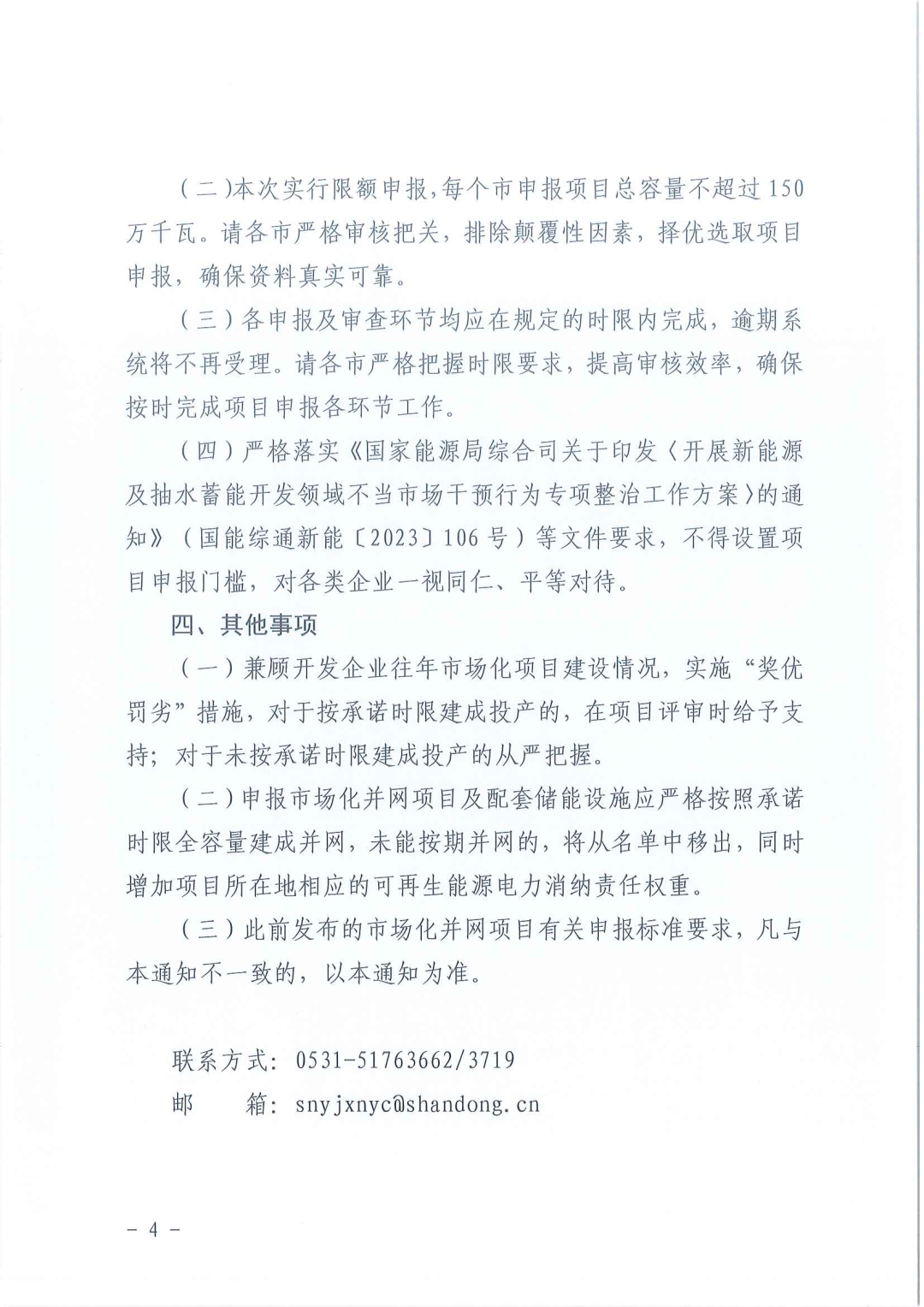 (四)嚴(yán)格落實(shí)《國家能源局綜合司關(guān)于印發(fā)〈開展新能源及抽水蓄能開發(fā)領(lǐng)域不當(dāng)市場干預(yù)行為專項(xiàng)整治工作方案〉的通知》(國能綜通新能〔2023〕106號)等文件要求,不得設(shè)置項(xiàng)目申報(bào)門檻,對各類企業(yè)一視同仁、平等對待。