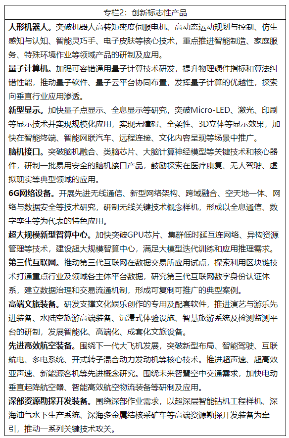 6.做強未來高端裝備。面向國家重大戰(zhàn)略需求和人民美好生活需要,加快實施重大技術裝備攻關工程,突破人形機器人、量子計算機、超高速列車、下一代大飛機、綠色智能船舶、無人船艇等高端裝備產(chǎn)品,以整機帶動新技術產(chǎn)業(yè)化落地,打造全球領先的高端裝備體系。深入實施產(chǎn)業(yè)基礎再造工程,補齊基礎元器件、基礎零部件、基礎材料、基礎工藝和基礎軟件等短板,夯實未來產(chǎn)業(yè)發(fā)展根基。