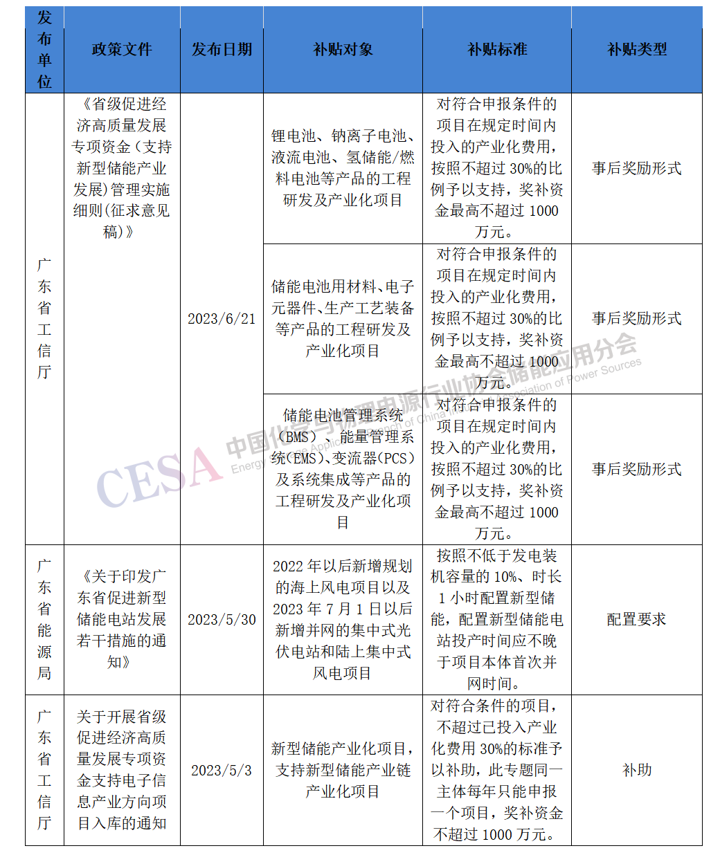 東莞發(fā)改局發(fā)布的《東莞市新型儲能產(chǎn)業(yè)高質(zhì)量發(fā)展專項資金管理辦法及相關工作指引(征求意見稿)》中,對投資主體和新型儲能企業(yè)提供了實際放電量補貼、利息資助、一次性獎勵、認證費用資助、平臺建設費用資助等多項支持。