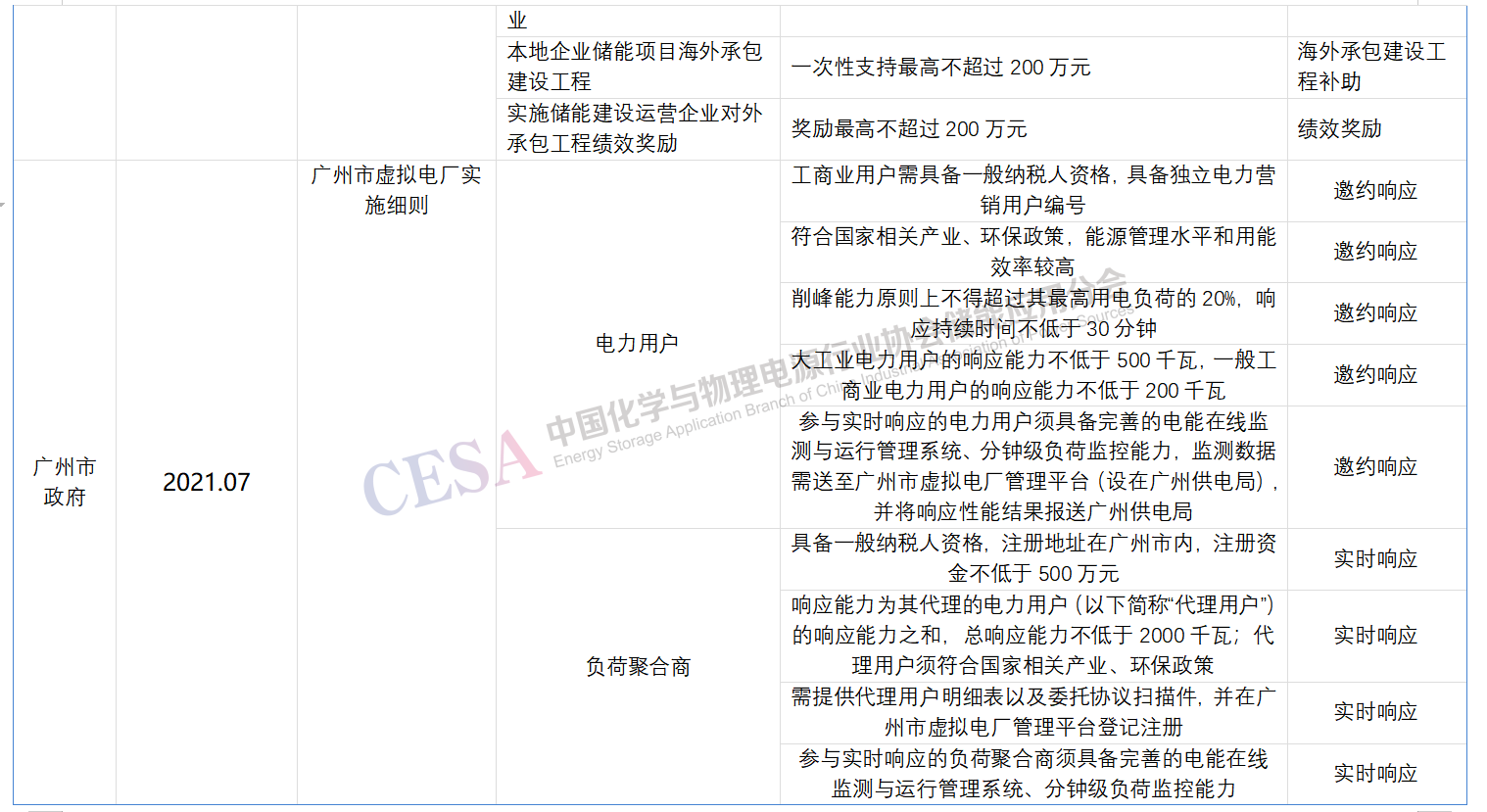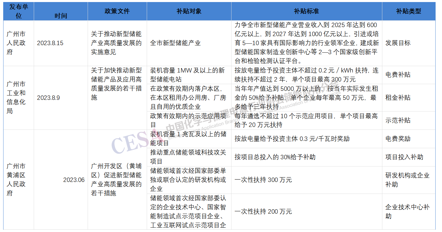 廣州市黃浦區(qū)人民政府發(fā)布的《廣州開發(fā)區(qū)(黃埔區(qū))促進新型儲能產(chǎn)業(yè)高質(zhì)量發(fā)展的若干措施》中,包括對裝機容量1兆瓦及以上的儲能項目,按放電量給予投資主體0.3元/千瓦時的電費獎勵,以及對儲能領域的研發(fā)機構或企業(yè)、企業(yè)技術中心等給予一次性扶持。