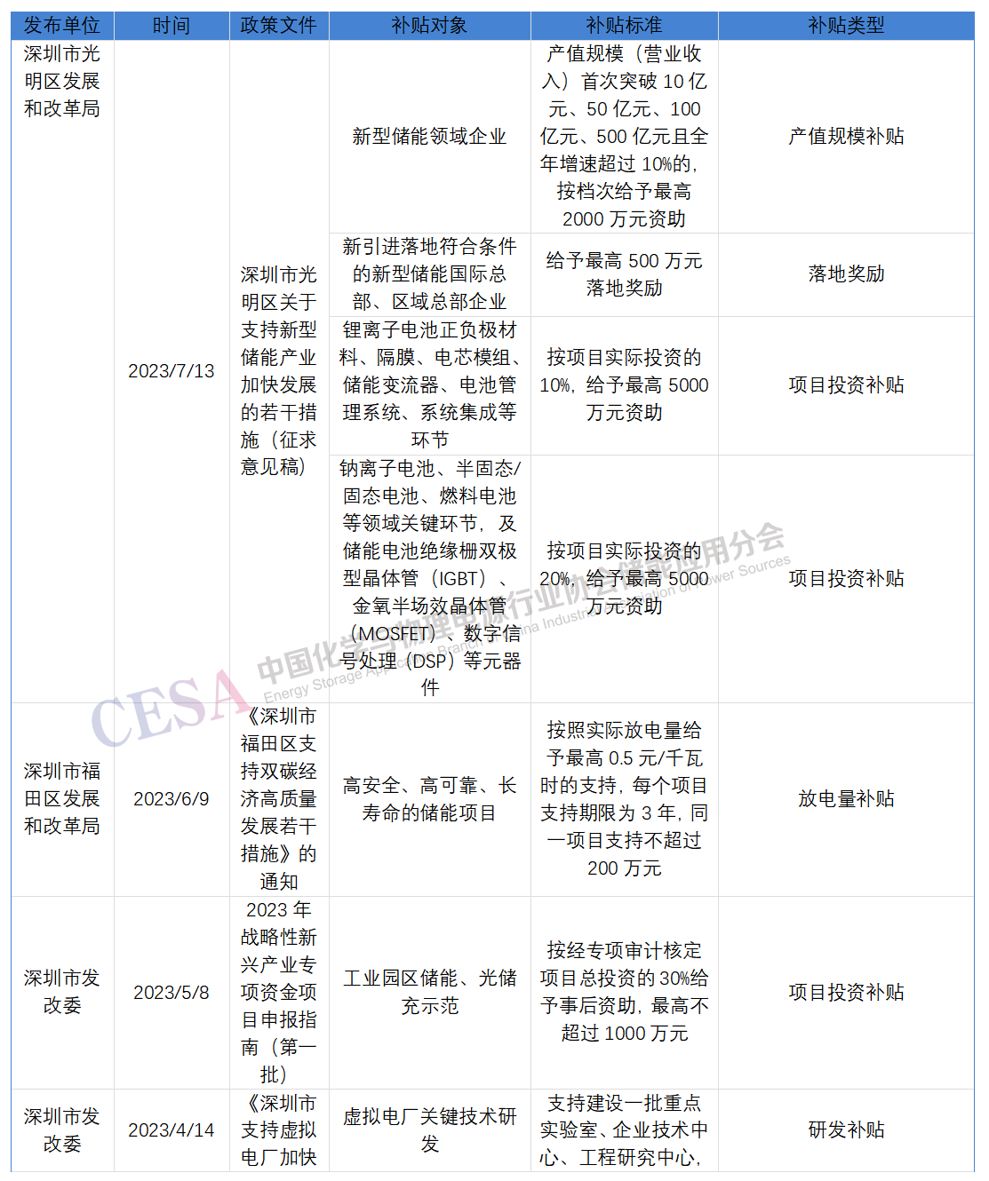 深圳市光明區(qū)發(fā)展和改革局發(fā)布的政策文件中,對新型儲能領域企業(yè)提供了產(chǎn)值規(guī)模補貼、落地獎勵、項目投資補貼等多項支持。其中,產(chǎn)值規(guī)模首次突破10億元、50億元、100億元、500億元且全年增速超過10%的企業(yè),將按檔次給予最高2000萬元資助。