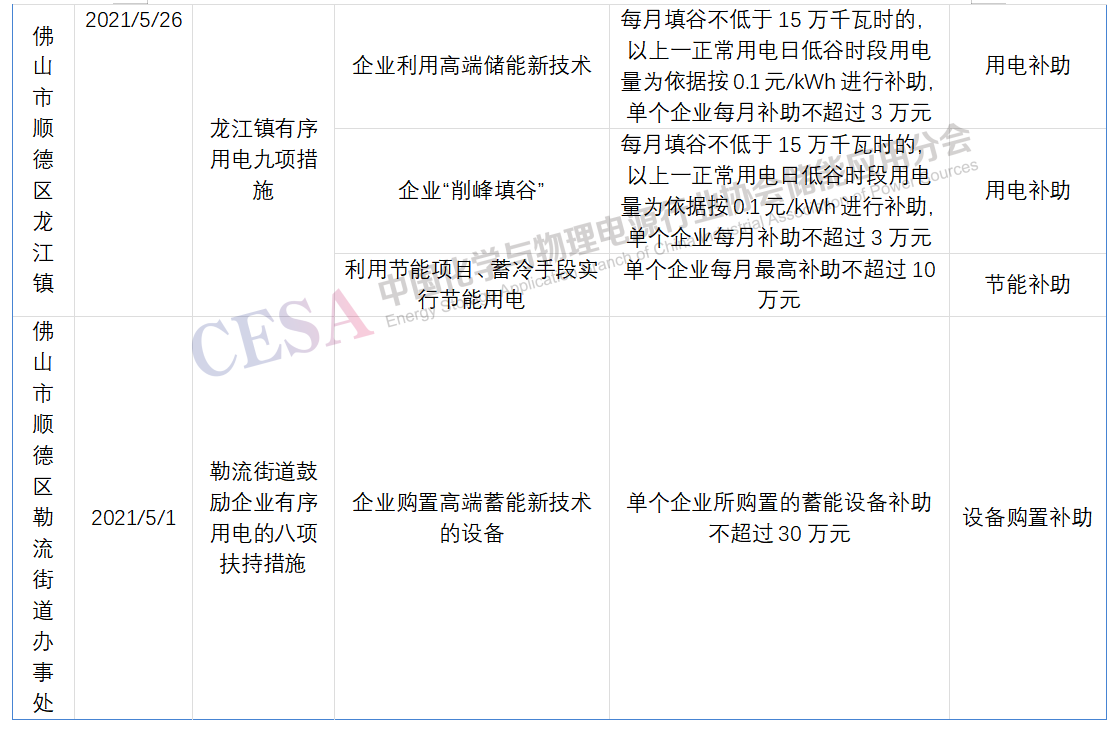 佛山市順德區(qū)容桂街道辦事處、龍江鎮(zhèn)、勒流街道辦事處分別于2021年5月發(fā)布了一系列鼓勵企業(yè)有序用電的扶持措施,對企業(yè)利用高端儲能新技術、企業(yè)“削峰填谷”、利用節(jié)能項目、蓄冷手段實行節(jié)能用電等進行補助。