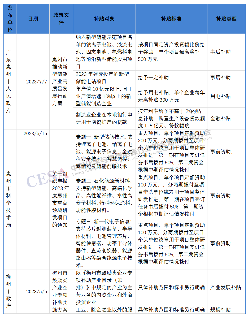 惠州市政府發(fā)布的《惠州市推動新型儲能產(chǎn)業(yè)高質(zhì)量發(fā)展行動方案》中,對納入新型儲能示范項目名單的鈉離子電池、液流電池、固態(tài)電池、氫燃料電池等前沿新型儲能應用項目,按項目固定資產(chǎn)投資額比例給予獎勵,單個項目最高獎補500萬元。此外,對2023年建成投產(chǎn)的新型儲能電站項目、年產(chǎn)值10億元以上且工業(yè)產(chǎn)值增速10%以上的新型儲能制造企業(yè)、制造業(yè)企業(yè)在本地銀行申請用于增資擴產(chǎn)的貸款等,都給予一定的補貼。