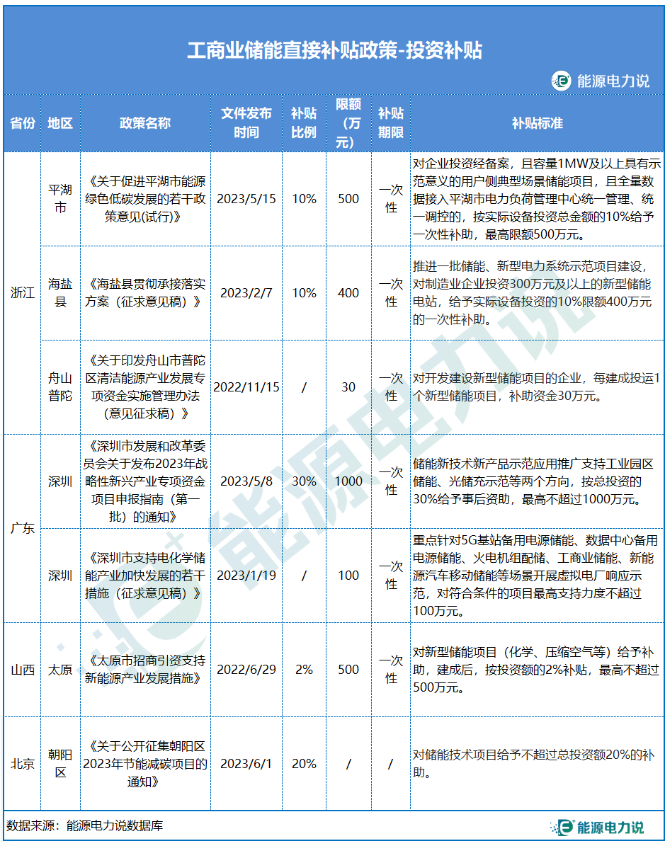 在投資補(bǔ)貼方面,今年浙江、廣東、北京等多省地區(qū)出臺(tái)了儲(chǔ)能投資補(bǔ)貼政策,投資補(bǔ)貼比例在2%-20%之間,單個(gè)項(xiàng)目補(bǔ)貼限額在30-1000萬(wàn)元之間,補(bǔ)貼期限多為一次性補(bǔ)貼。其中今年5月深圳發(fā)布的《深圳市發(fā)展和改革委員會(huì)關(guān)于發(fā)布2023年戰(zhàn)略性新興產(chǎn)業(yè)專項(xiàng)資金項(xiàng)目申報(bào)指南(第一批)的通知》中補(bǔ)貼力度一騎絕塵,提出儲(chǔ)能新技術(shù)新產(chǎn)品示范應(yīng)用推廣支持工業(yè)園區(qū)儲(chǔ)能、光儲(chǔ)充示范等兩個(gè)方向,按總投資的30%給予事后資助,最高補(bǔ)貼1000萬(wàn)元。