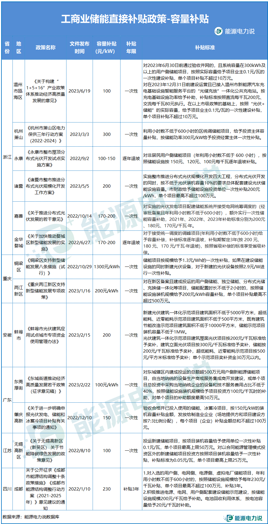 2022年至今,浙江、廣東、江蘇、重慶、安徽、天津等多個(gè)地區(qū)陸續(xù)工商業(yè)儲(chǔ)能直接補(bǔ)貼政策。對(duì)工商業(yè)儲(chǔ)能給予直接補(bǔ)貼政策,也成為一些地方政府爭(zhēng)取項(xiàng)目投資、產(chǎn)業(yè)落地的重要手段之一。