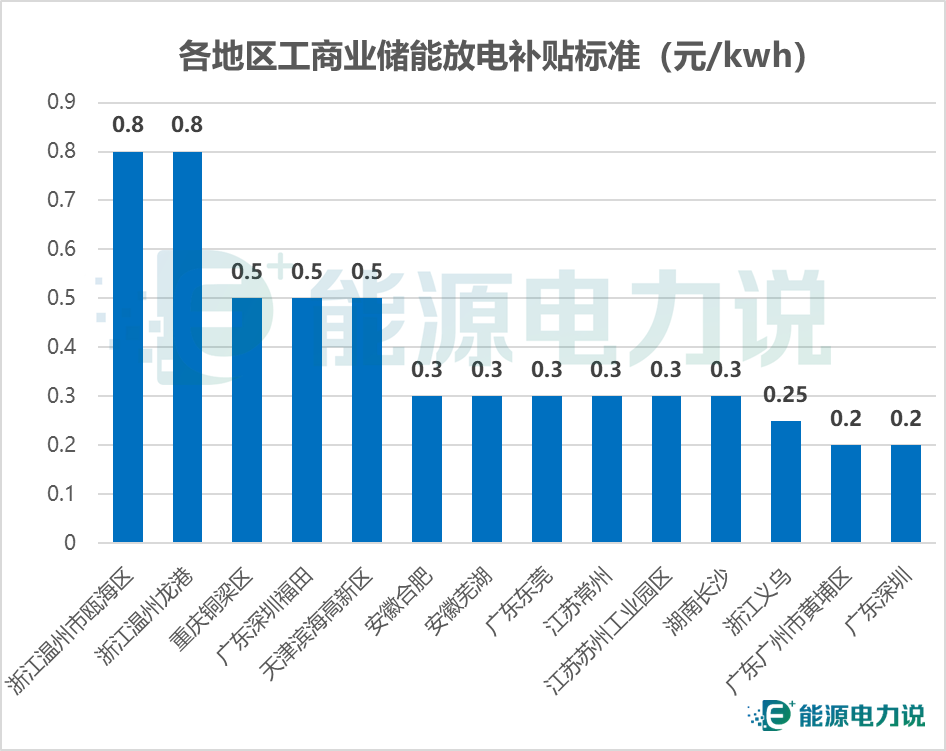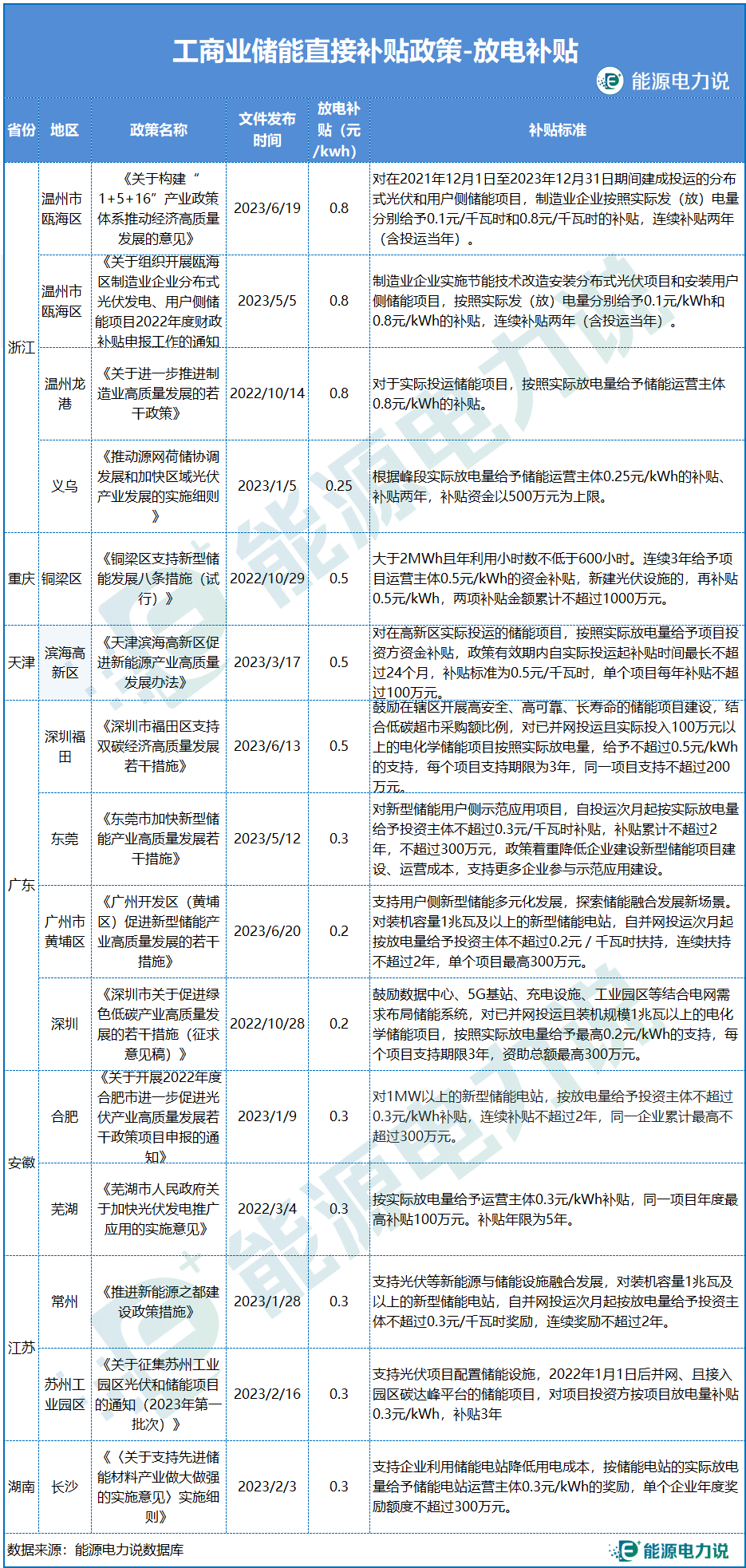 放電補(bǔ)貼方面,浙江溫州甌海區(qū)、龍港補(bǔ)貼標(biāo)準(zhǔn)最高,對(duì)投運(yùn)的儲(chǔ)能項(xiàng)目按照實(shí)際放電量給予儲(chǔ)能運(yùn)營(yíng)主體0.8元/kWh的補(bǔ)貼;重慶銅梁區(qū)在補(bǔ)貼方面,對(duì)大于2MWh且年利用小時(shí)數(shù)不低于600小時(shí),連續(xù)3年給予項(xiàng)目運(yùn)營(yíng)主0.5元/kWh的補(bǔ)貼;深圳福田、天津高新區(qū)濱海高新區(qū)對(duì)在區(qū)域內(nèi)投運(yùn)的項(xiàng)目,0.5元/kWh的補(bǔ)貼。