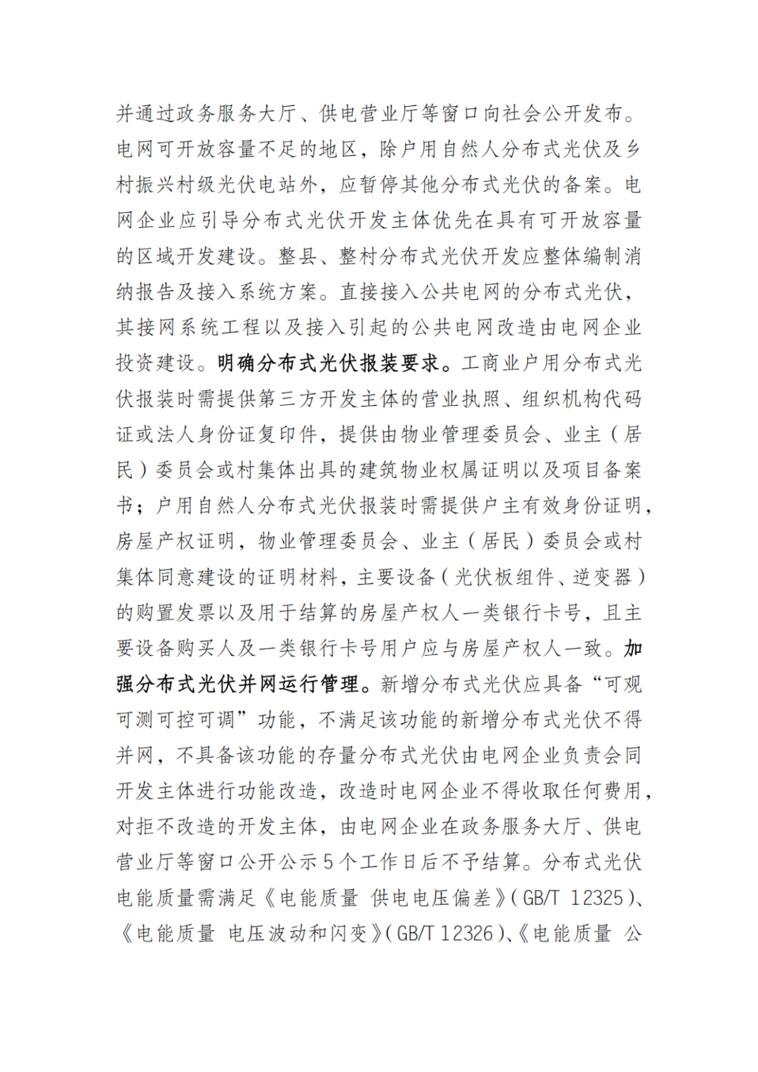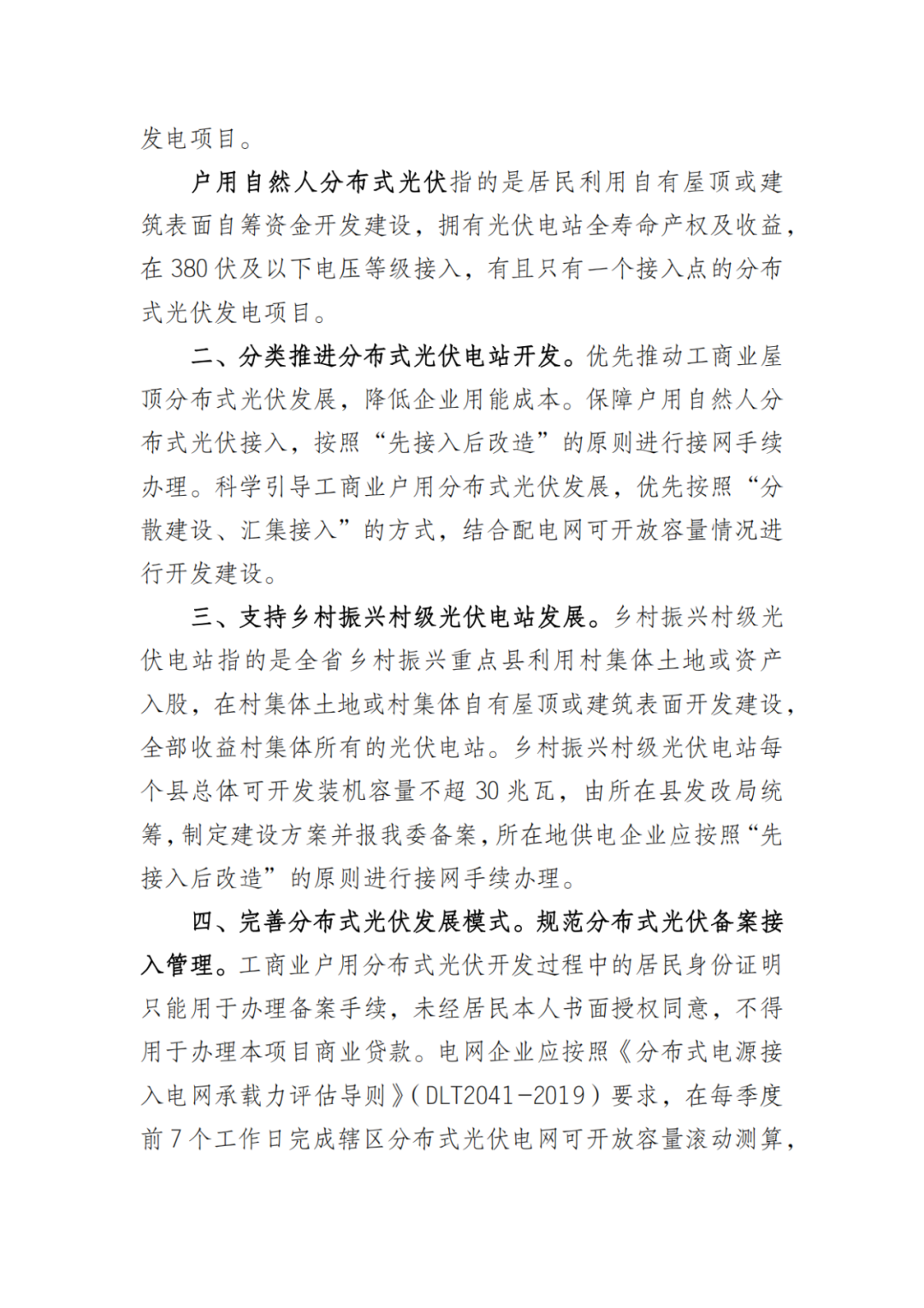 此外,電網(wǎng)企業(yè)應(yīng)在每季度前7個(gè)工作日完成轄區(qū)分布式光伏電網(wǎng)可開放容量滾動(dòng)測算,并通過政務(wù)服務(wù)大廳、供電營業(yè)廳等窗口向社會公開發(fā)布。戶用自然人分布式光伏、鄉(xiāng)村振興村級光伏電站:所在地供電企業(yè)應(yīng)按照“先接入后改造”的原則進(jìn)行接網(wǎng)手續(xù)辦理工商業(yè)戶用分布式光伏:優(yōu)先按照“分散建設(shè)、匯集接入”的方式,結(jié)合配電網(wǎng)可開放容量情況進(jìn)行開發(fā)建設(shè)。電網(wǎng)可開放容量不足的地區(qū),除戶用自然人分布式光伏及鄉(xiāng)村振興村級光伏電站外,應(yīng)暫停其他分布式光伏的備案。