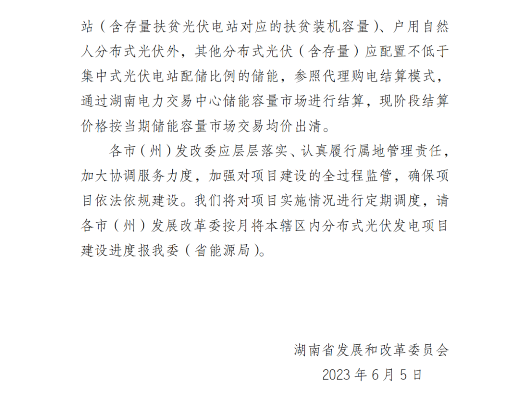 除鄉(xiāng)村振興村級光伏電站(含存量扶貧光伏電站對應(yīng)的扶貧裝機(jī)容量)、戶用自然人分布式光伏外,其他分布式光伏(含存量)應(yīng)配置不低于集中式光伏電站配儲比例的儲能,參照代理購電結(jié)算模式,通過湖南電力交易中心儲能容量市場進(jìn)行結(jié)算,現(xiàn)階段結(jié)算價(jià)格按當(dāng)期儲能容量市場交易均價(jià)出清。