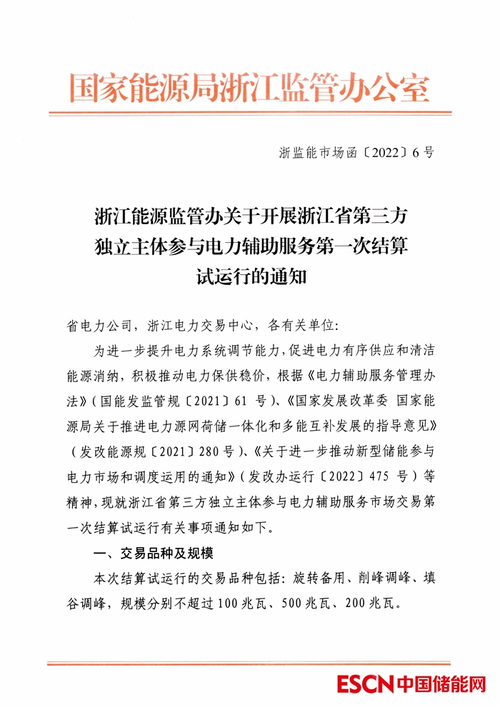 中國儲能網(wǎng)訊:日前,浙江能監(jiān)辦發(fā)布關(guān)于開展浙江省第三方獨(dú)立主體參與電力輔助服務(wù)第一次結(jié)算試運(yùn)行的通知。文件指出,本次結(jié)算試運(yùn)行的交易品種包括:旋轉(zhuǎn)備用、削峰調(diào)峰、填谷調(diào)峰,規(guī)模分別不超過100兆瓦、500兆瓦、200兆瓦。