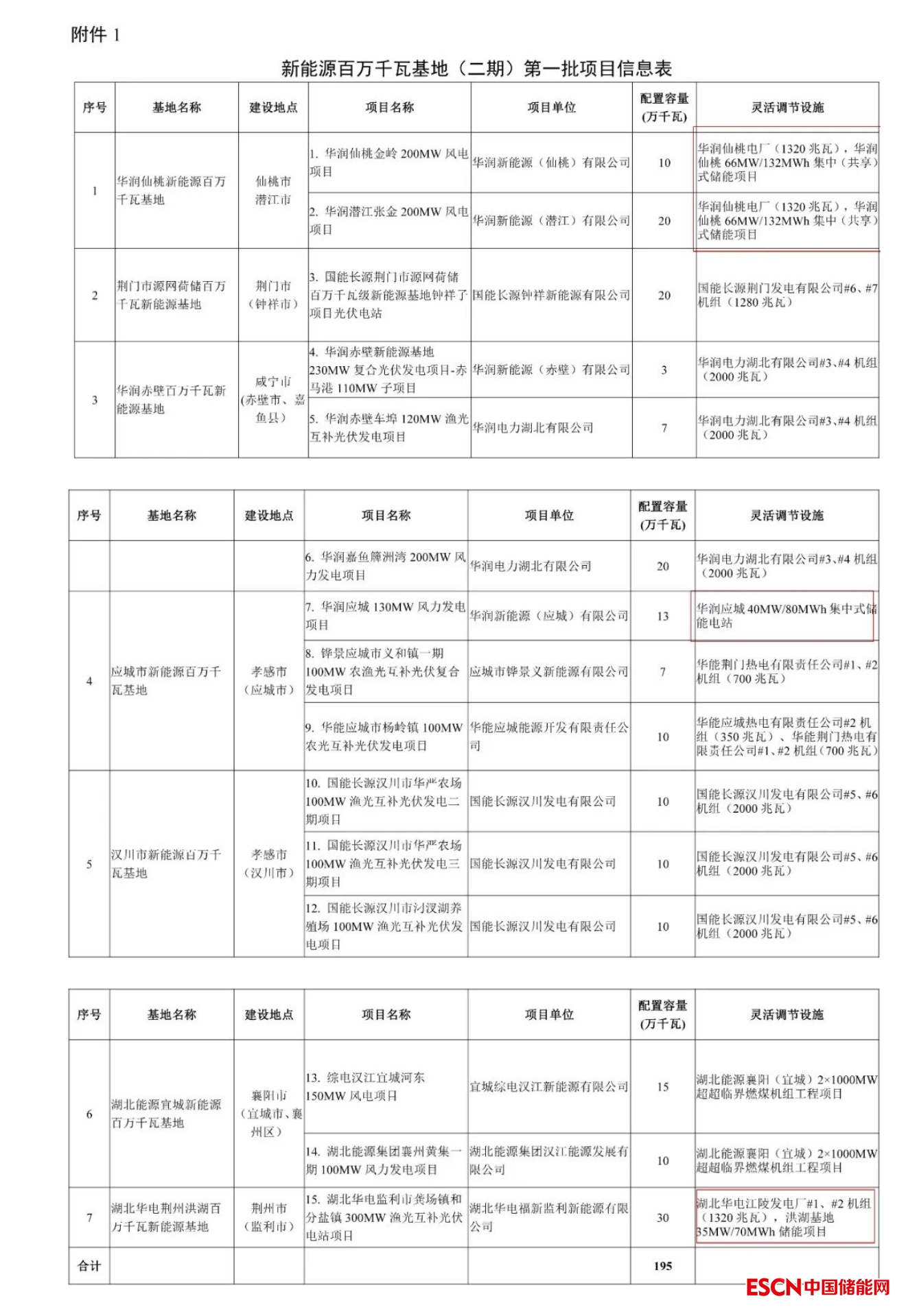 一、包括7個(gè)風(fēng)光火儲新能源百萬千瓦基地(二期)項(xiàng)目共計(jì)15個(gè),容量195萬千瓦,其中:風(fēng)電項(xiàng)目6個(gè)、容量88萬千瓦;光伏發(fā)電項(xiàng)目9個(gè)、容量107萬千瓦。涉及靈活調(diào)節(jié)配儲包含:華潤仙桃66MW/132MWh集中(共享)式儲能項(xiàng)目,華潤應(yīng)城40MW/80MWh集中式儲能電站和華電洪湖基地35MW/70MWh儲能項(xiàng)目。