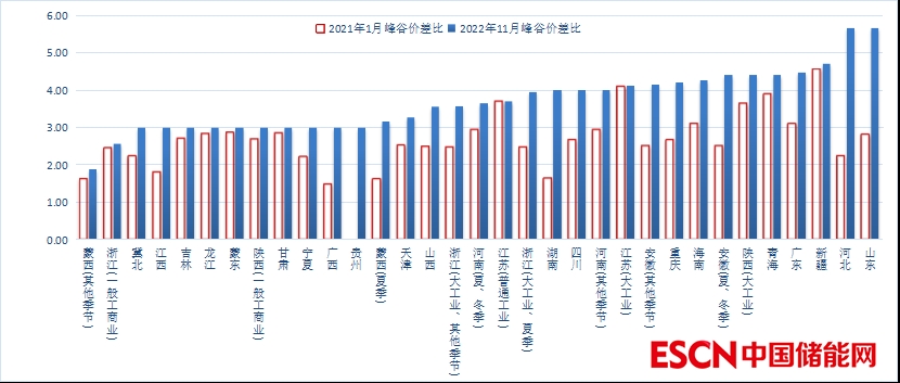 高峰電價(jià)與低谷電價(jià)的比值普遍超過3倍,近一半統(tǒng)計(jì)結(jié)果接近或超過4倍,其中山東與河北南網(wǎng)的峰谷價(jià)差比更達(dá)到5.67倍,明顯超過其他地區(qū)。與2021年1月時(shí)各地峰谷價(jià)差相比,除江蘇未調(diào)整高峰、低谷電價(jià)外,其他地區(qū)峰谷價(jià)差比都有所加大。