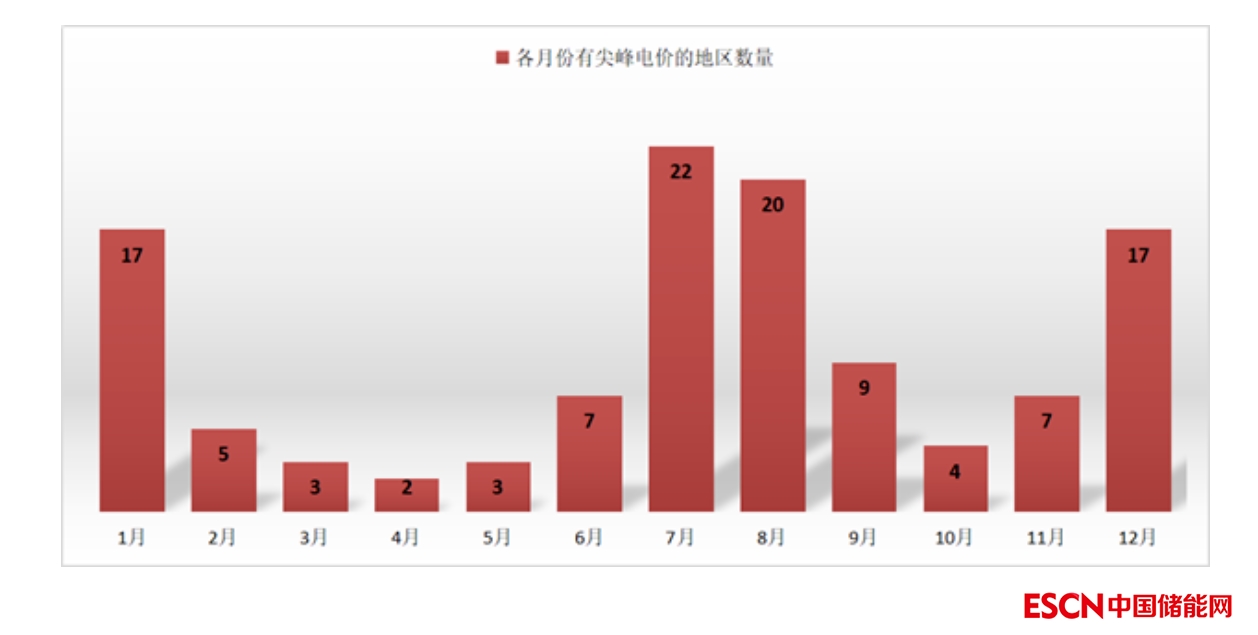從分布月份看,絕大部分地區(qū)峰谷時(shí)段劃分都體現(xiàn)了季節(jié)差異。尖峰電價(jià)方面,除浙江、安徽和廣東外的所有執(zhí)行尖峰電價(jià)的地區(qū)都體現(xiàn)了季節(jié)性設(shè)定,即尖峰時(shí)段出現(xiàn)在固定月份而非全部月份,其中1月、7月、8月和12月是執(zhí)行尖峰政策主要月份。浙江無論是大工業(yè)還是一般工商業(yè),在全年各月均有固定尖峰時(shí)段;安徽未設(shè)計(jì)固定的尖峰時(shí)段,而是在全年按氣溫≤-5℃或≥36℃靈活執(zhí)行上浮;廣東則綜合采用了固定月份尖峰和全年氣溫尖峰兩種方式,7-9月整月及其他月份中日最高氣溫達(dá)到35℃及以上的高溫天實(shí)施尖峰電價(jià)。