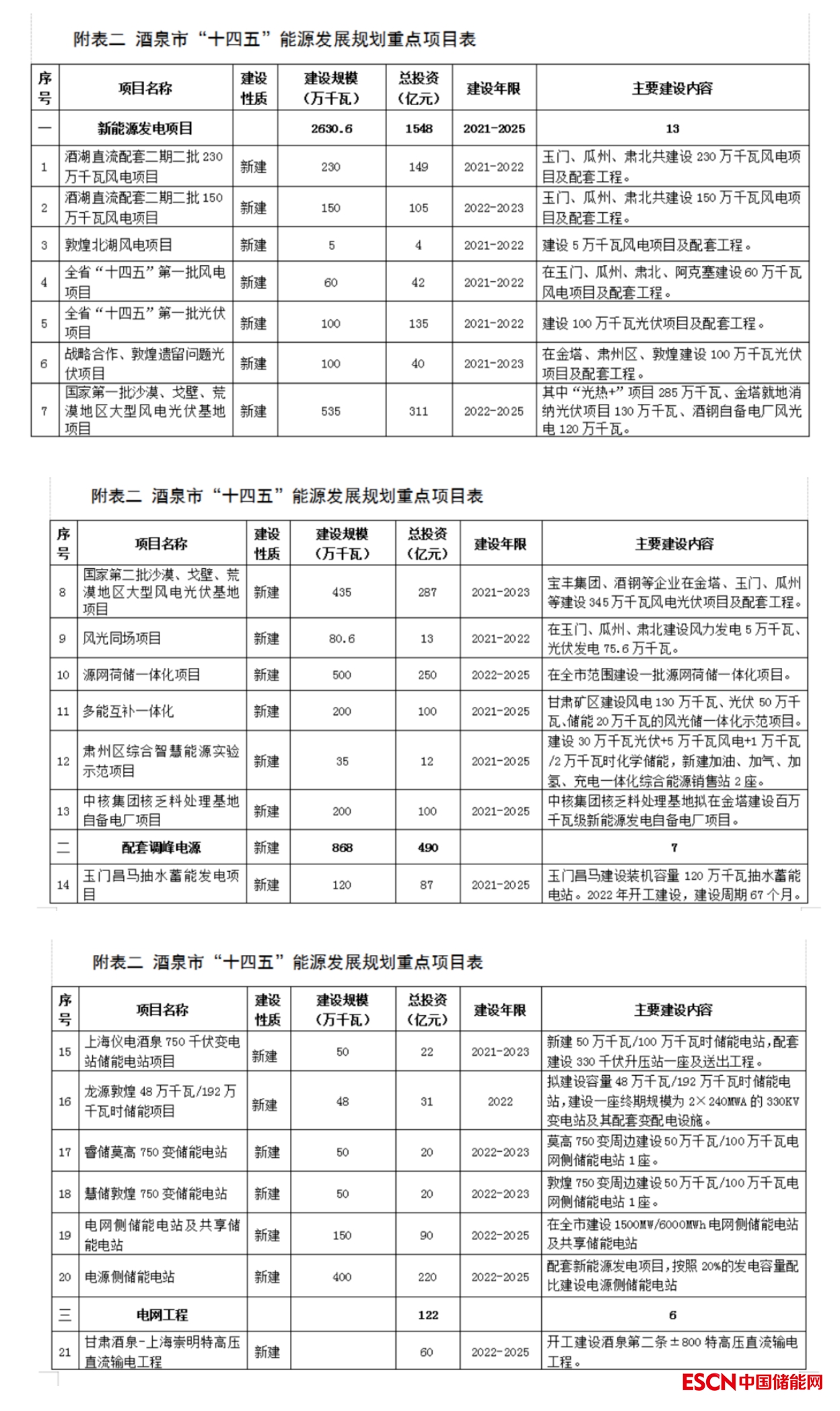 值得注意的是,酒泉市還發(fā)布了“十四五”能源發(fā)展規(guī)劃的重點(diǎn)項(xiàng)目表。其中新能源發(fā)電項(xiàng)目共2630.6萬千瓦,總投資1548億元。主要建設(shè)項(xiàng)目包括:酒湖直流配套二期二批風(fēng)電項(xiàng)目、國家第一批沙漠、戈壁、荒漠地區(qū)大型風(fēng)電光伏基地項(xiàng)目以及全省“十四五”第一批光伏、風(fēng)電項(xiàng)目等13個大型新能源項(xiàng)目。具體情況如下: