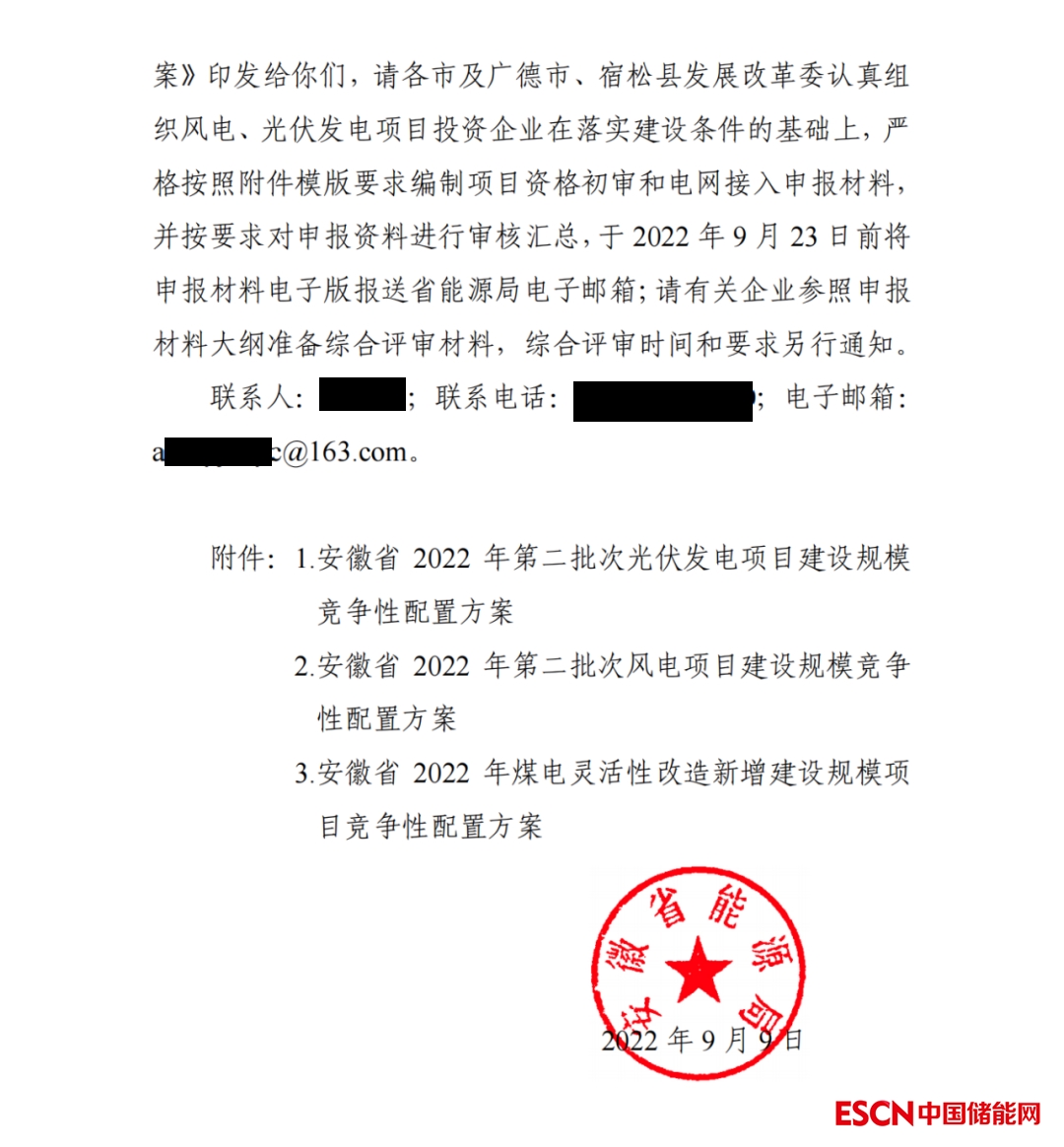 中國儲能網(wǎng)訊:9月9日,安徽省能源局下發(fā)了《關(guān)于開展 2022 年第二批次風(fēng)電和光伏發(fā)電項目建設(shè)規(guī)模競爭性配置工作的通知》,此次光伏、風(fēng)電指標(biāo)各1.5GW,共計3GW。