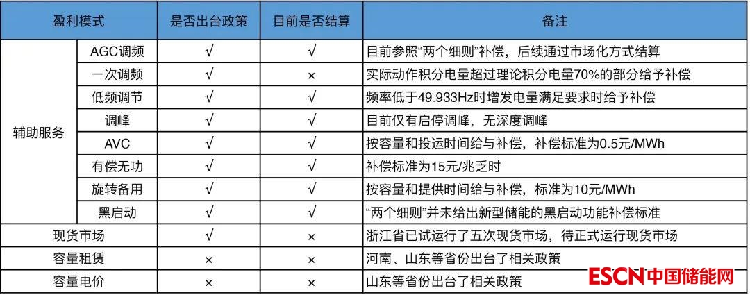 新型儲(chǔ)能電站的主要收益來源包括政策補(bǔ)貼、輔助服務(wù)、現(xiàn)貨市場(chǎng)、容量租賃、容量電價(jià)等。浙江省新型儲(chǔ)能盈利模式情況如下表: