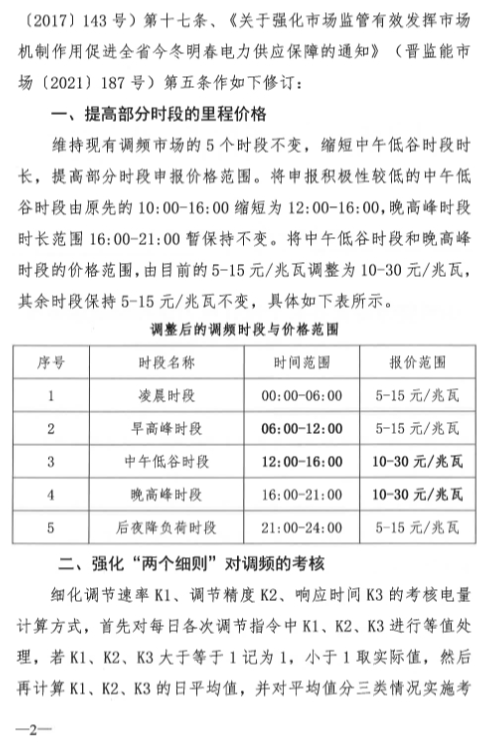 中國儲能網(wǎng)訊:近日,山西能源監(jiān)管辦發(fā)布關(guān)于修訂電力調(diào)頻輔助服務(wù)市場有關(guān)規(guī)定條款的通知,提高部分時(shí)段里程價(jià)格,強(qiáng)化“兩個(gè)細(xì)則”對調(diào)頻的考核。