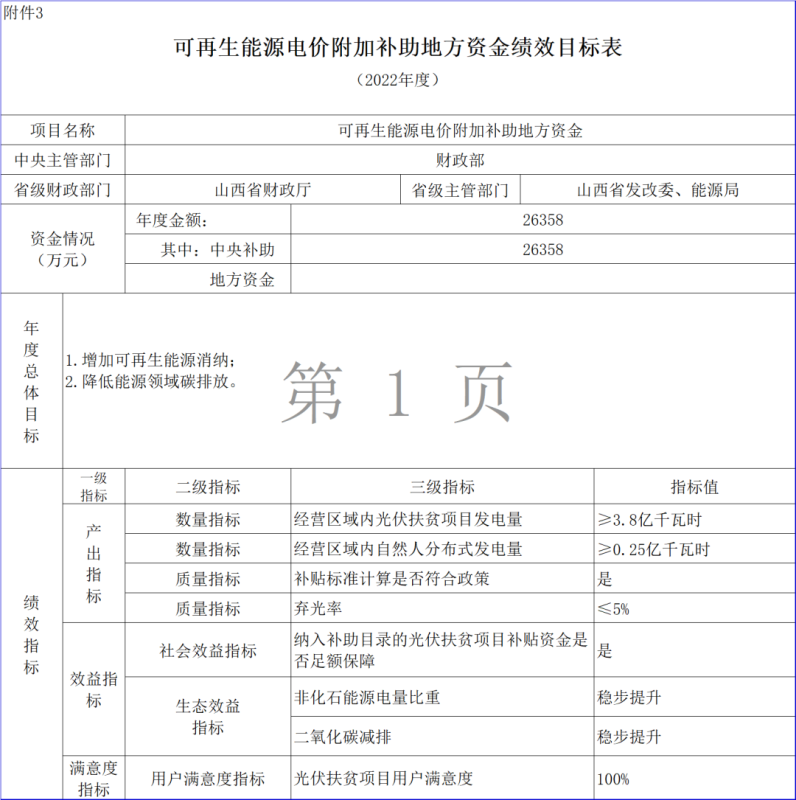 五、為保障資金安全,提高資金使用效率,電網企業(yè)應按年度對補貼資金申請使用等情況進行全面核查,必要時可聘請獨立第三方,同時做好績效自評。電網企業(yè)應在6月30日前將2021年及以前年度補貼資金撥付情況報送至國家可再生能源信息管理中心。統(tǒng)計信息包括項目代碼、項目名稱、項目業(yè)主、裝機容量、上網電價、補貼強度、撥付金額等。為深入貫徹落實《中共中央 國務院關于全面實施預算績效管理的意見》,切實提高財政資金使用效益,請你單位有關部門在組織預算執(zhí)行中對照績效目標(附件3)做好績效監(jiān)控,確保年度績效目標如期實現(xiàn)。同時,你單位應按規(guī)定及時上報績效自評結果,績效自評結果將作為分配預算資金的重要依據(jù)。
