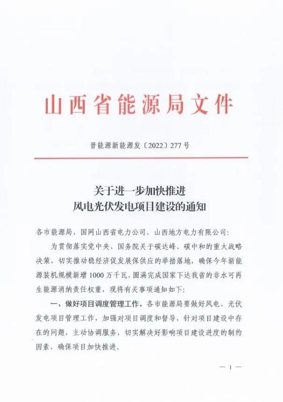 中國(guó)儲(chǔ)能網(wǎng)訊:近日,山西省能源局印發(fā)《關(guān)于進(jìn)一步加快推進(jìn)風(fēng)電光伏發(fā)電項(xiàng)目建設(shè)的通知》,提出了新能源裝機(jī)規(guī)模新增1000萬千瓦(10GW)的目標(biāo),同時(shí)要求,各市能源局按照項(xiàng)目建設(shè)進(jìn)度、預(yù)計(jì)并網(wǎng)時(shí)間對(duì)項(xiàng)目進(jìn)行大排序,于2022年6月28日將排序結(jié)果報(bào)省能源局。省能源局會(huì)同省電力公司對(duì)各市上報(bào)情況研究后合理安排項(xiàng)目并網(wǎng)。
