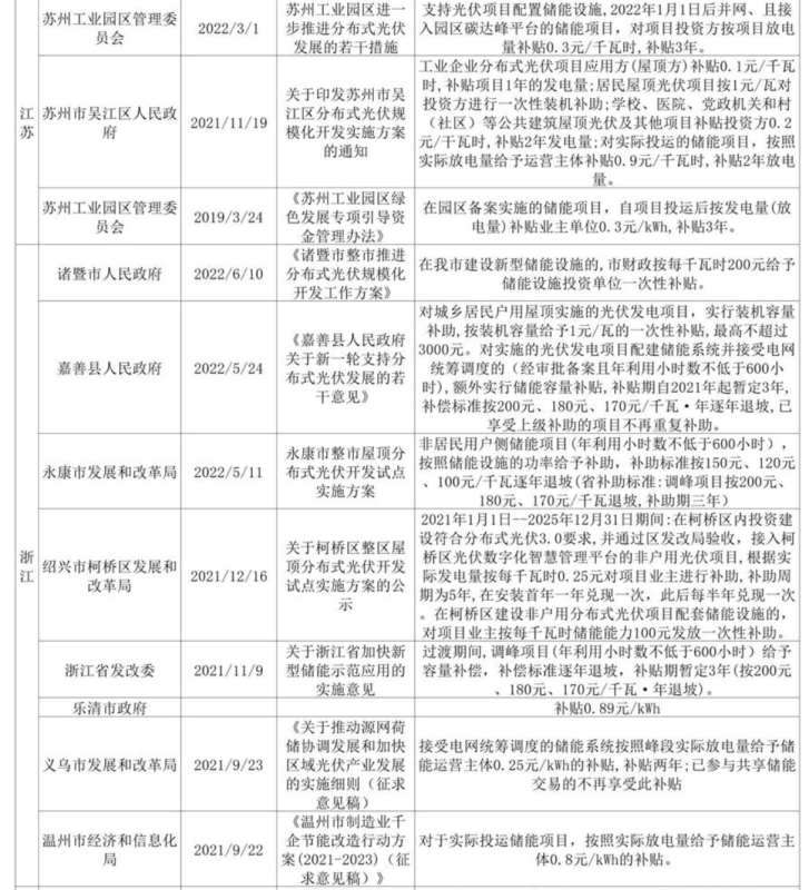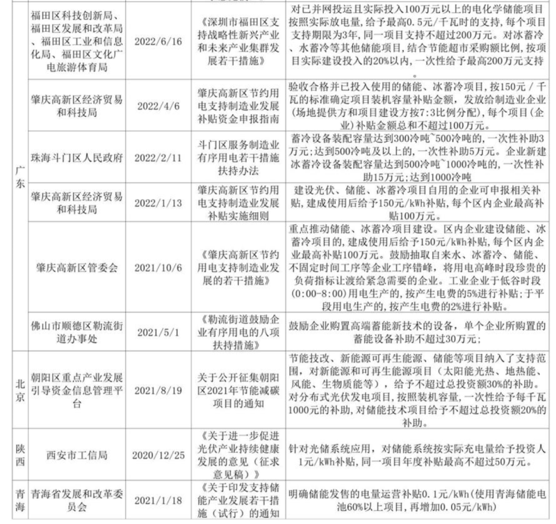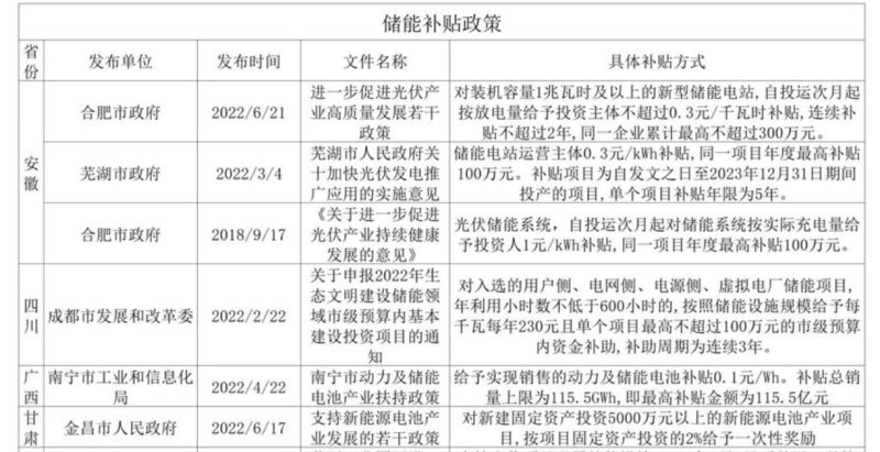 2022年各省市儲(chǔ)能補(bǔ)貼詳情: