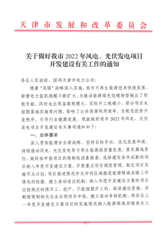 中國儲能網(wǎng)訊:6月2日,天津市印發(fā)《關(guān)于做好我市2022年風(fēng)電、光伏發(fā)電項目開發(fā)建設(shè)有關(guān)工作》的通知。