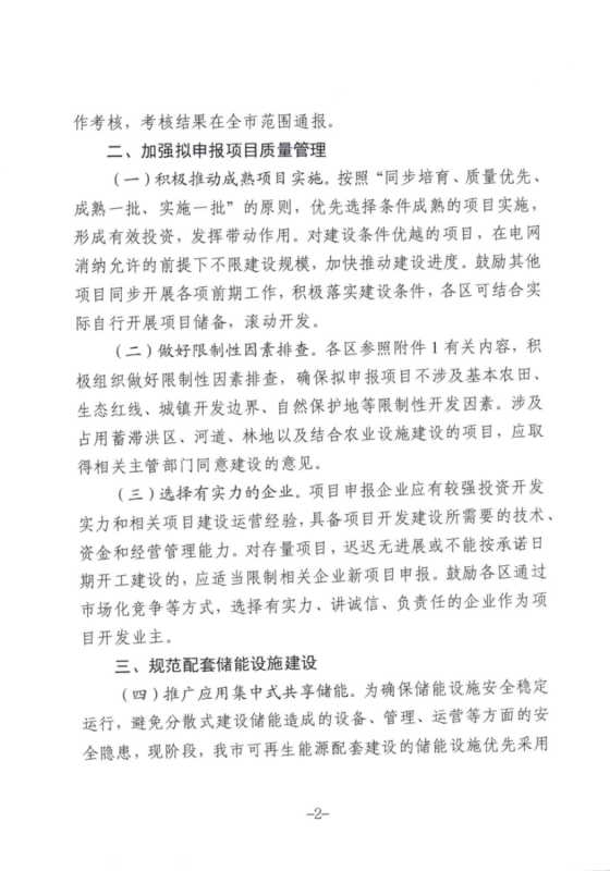 根據(jù)《通知》,加強(qiáng)擬申報項目質(zhì)量管理。對建設(shè)條件優(yōu)越的項目,在電網(wǎng)消納允許的前提下不限建設(shè)規(guī)模,加快推動建設(shè)進(jìn)度。同時規(guī)范項目的配套儲能設(shè)施建設(shè),推廣應(yīng)用集中式共享儲能。