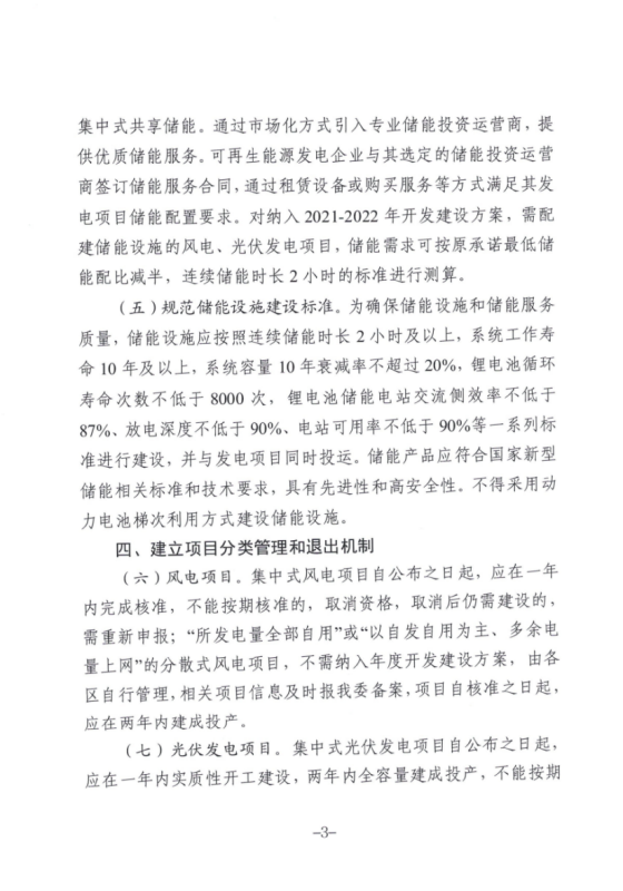 對納入2021-2022年開發(fā)建設(shè)方案,需配建儲能設(shè)施的風(fēng)電、光伏發(fā)電項目,儲能需求可按原承諾最低儲能配比減半,連續(xù)儲能時長2小時的標(biāo)準(zhǔn)進(jìn)行測算。