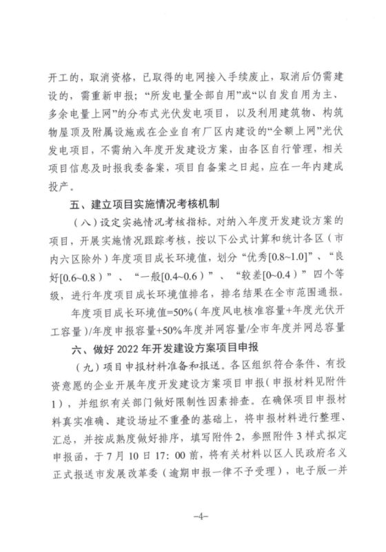 對納入年度開發(fā)建設(shè)方案的項目,開展實施情況跟蹤考核??己斯綖椋耗甓软椖砍砷L環(huán)境值=50%(年度風(fēng)電核準(zhǔn)容量+年度光伏開工容量)/年度申報容量+50%年度并網(wǎng)容量/全市年度并網(wǎng)總?cè)萘?