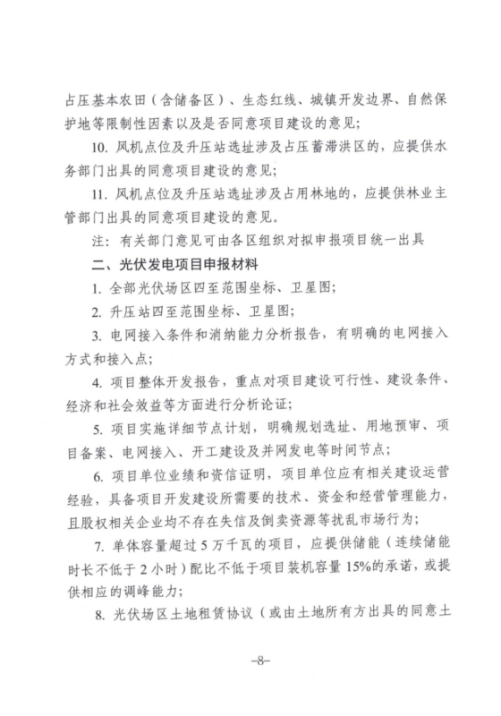 項目申報要求:嚴(yán)禁隨意拆分項目,相同或臨近地點建設(shè)的歸屬同一集團(tuán)公司的多個項目,單體容量不超過5萬千瓦的,全部視為同一項目,儲能設(shè)施配比按終期建設(shè)容量考慮。單體容量超過5萬千瓦的項目,應(yīng)提供儲能(連續(xù)儲能時長不低于2小時)配比不低于項目裝機(jī)容量15%的承諾,或提供相應(yīng)的調(diào)峰能力。