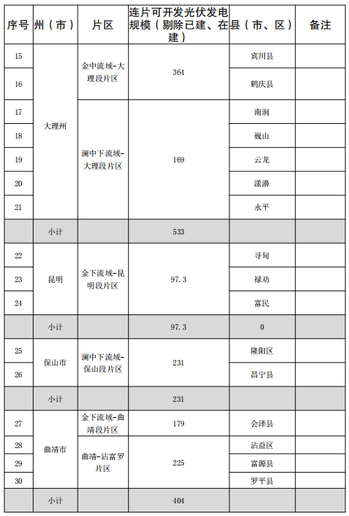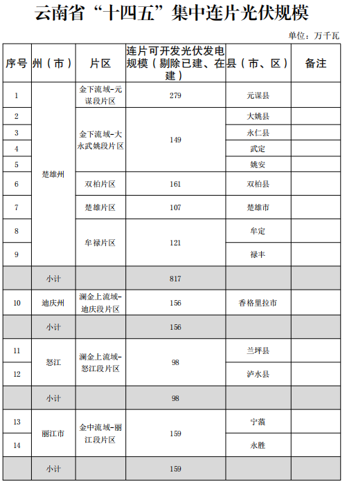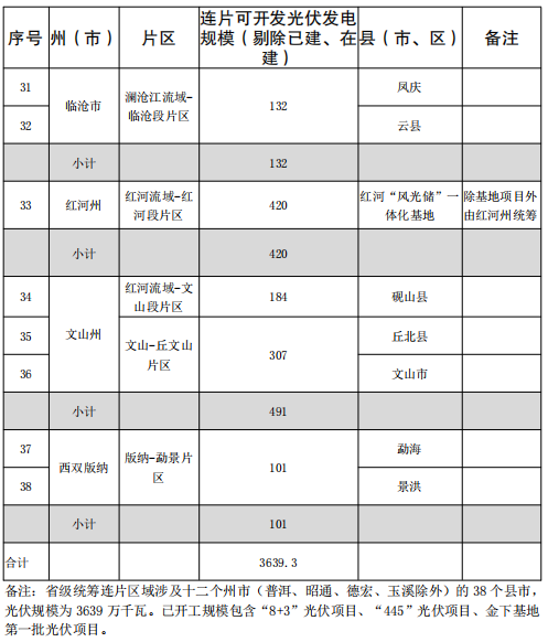文件明確,根據(jù)云南省“十四五”可再生能源規(guī)劃,按照集中開發(fā)、規(guī)模化開發(fā)原則,以光伏資源豐富的縣(市、區(qū))為劃分基礎(chǔ),形成省級統(tǒng)籌管理的19個連片光伏資源區(qū),涉及十二個州市(普洱、昭通、德宏、玉溪除外)的38個縣市,光伏規(guī)模為3639萬千瓦。已開工規(guī)模包含“8+3”光伏項目、“445”光伏項目、金下基地第一批光伏項目。