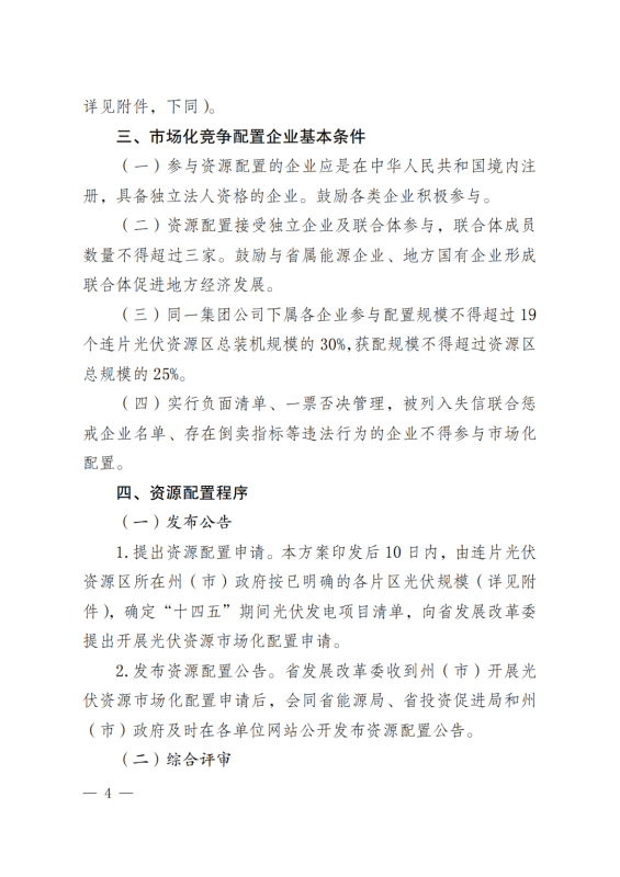 另外,征求意見函中要求申報企業(yè)同一集團(tuán)公司下屬各企業(yè)參與配置規(guī)模不得超過19個連片光伏資源區(qū)總裝機(jī)規(guī)模的30%,獲配規(guī)模不得超過資源區(qū)總規(guī)模的25%。資源配置接受獨(dú)立企業(yè)及聯(lián)合體參與,聯(lián)合體成員數(shù)量不得超過三家。