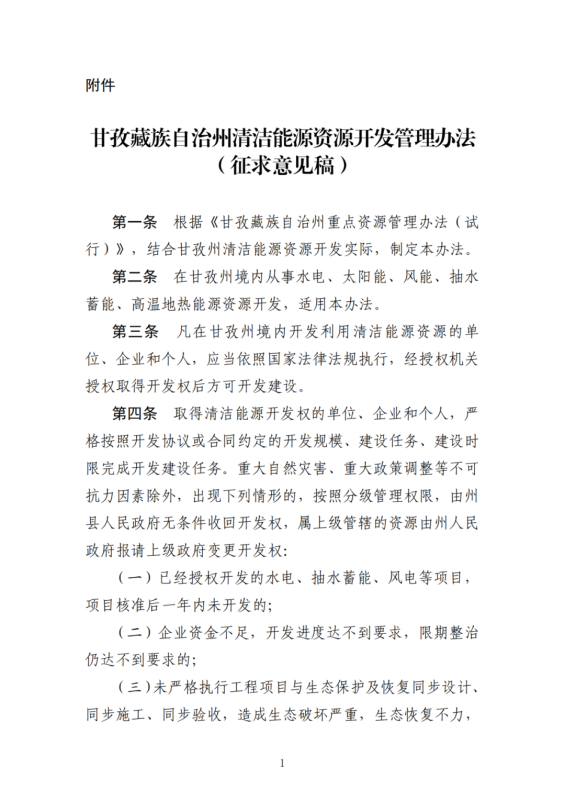 附件:《甘孜藏族自治州清潔能源資源開發(fā)管理辦法(征求意見稿)》