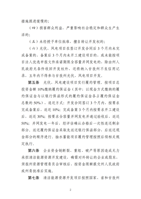 (六)光伏、風電項目在簽訂開發(fā)合同后3個月內(nèi)未完成備案的,備案后3個月內(nèi)未開工建設(shè)項目的,或未能按項目法人優(yōu)選申報文件承諾期限全容量并網(wǎng)發(fā)電的,除由州人民政府無條件收回開發(fā)權(quán)外,還將納入甘孜州不良信用記錄,五年內(nèi)不得參與甘孜州光伏、風電項目開發(fā)。