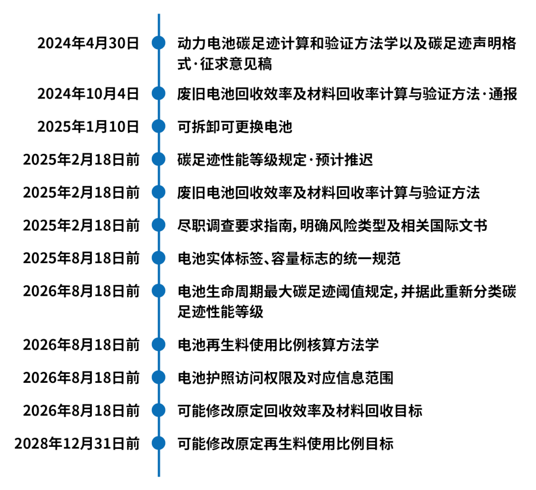 縱覽《電池法》二級法案發(fā)布情況,原計(jì)劃于2024年2月正式發(fā)布的碳足跡二級法案僅在歐洲議會官網(wǎng)發(fā)布征求意見稿,預(yù)計(jì)原定于今年2月正式發(fā)布的碳足跡等級規(guī)定將一并推遲;回收率二級法案已通報(bào),根據(jù)《電池法》規(guī)劃預(yù)計(jì)今年2月正式發(fā)布,預(yù)計(jì)同期發(fā)布的還有盡職調(diào)查要求指南;今年8月18日前還預(yù)計(jì)發(fā)布電池實(shí)體標(biāo)簽、容量標(biāo)志的統(tǒng)一規(guī)范。2026年,碳足跡最大閾值、電池護(hù)照訪問權(quán)限、再生料比例核算二級法案將發(fā)布,回收率要求或?qū)⑿薷?。上述二級法案及補(bǔ)充規(guī)范,均需要企業(yè)做好研究應(yīng)對工作。