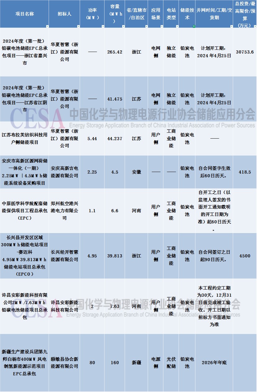從市場(chǎng)情況來(lái)看,據(jù)CESA儲(chǔ)能應(yīng)用分會(huì)不完全統(tǒng)計(jì)2024年應(yīng)用鉛炭電池技術(shù)的新型儲(chǔ)能招標(biāo)項(xiàng)目共計(jì)8個(gè),規(guī)模合計(jì)95.74MW/569.67MWh,投資總額35672.06萬(wàn)元。其中最大投資額項(xiàng)目為2024年度(第一批)鉛炭電池儲(chǔ)能EPC總承包項(xiàng)目,具體建設(shè)地點(diǎn)位于浙江省嘉興市與江蘇省江陰市,擬新建AGM鉛酸鉛炭電池儲(chǔ)能電站,裝機(jī)容量分別為265.421MWh、41.475MWh。項(xiàng)目充分利用所在地區(qū)峰谷電價(jià)特點(diǎn),通過合理規(guī)劃儲(chǔ)能,可節(jié)約電力資源,降低能耗成本,對(duì)提升當(dāng)?shù)仉娋W(wǎng)平衡調(diào)節(jié)和安全保障能力具有重要意義。項(xiàng)目將采用先進(jìn)的鉛炭電池技術(shù),為相關(guān)區(qū)域提供高效、穩(wěn)定的儲(chǔ)能解決方案,助力能源的優(yōu)化配置和利用。計(jì)劃開工期為2024 年4月25日。