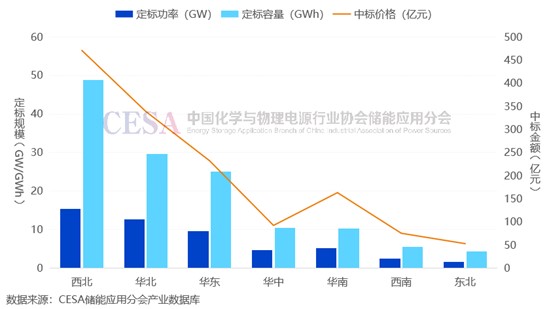 此外,華中地區(qū)定標(biāo)規(guī)模4.68GW/10.51GWh,容量占比7.76%,總金額達(dá)92.42億元。華南地區(qū)采招落地5.24GW/10.21GWh,容量占比7.61%,總成交金額達(dá)163.33億元。西南地區(qū)定標(biāo)規(guī)模2.46GW/5.61GWh,容量占比4.18%,總金額75.41億元。東北地區(qū)采招落地1.65GW/4.34GWh,容量占比3.23%,總成交金額52.94億元。