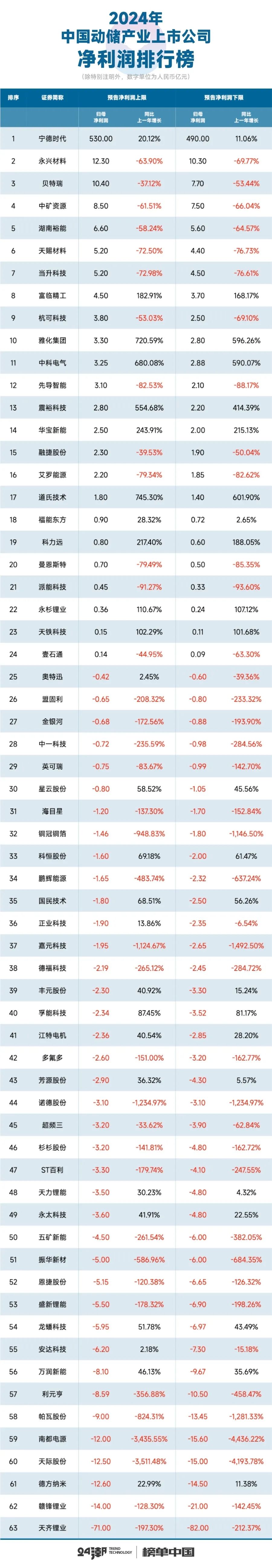 全年,多達39家動儲企業(yè)出現虧損,占比達62%,虧損企業(yè)數量比2023年增加了12家。具體到企業(yè)層面,2024年寧德時代全年盈利490-530億元,盈利能力是第二名到第二十名之和(65.15-80.15億元)的7.52倍-6.61倍,是無可爭議的盈利之王。