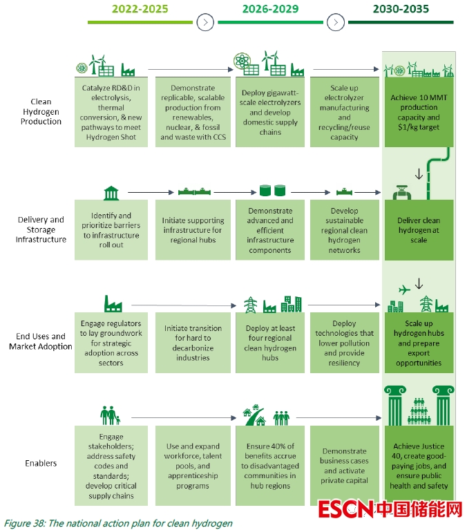 (3)聚焦區(qū)域網(wǎng)絡(luò)。這包括區(qū)域清潔氫能中心(clean hydrogen hubs),以實(shí)現(xiàn)大規(guī)模的清潔氫生產(chǎn)和就近的終端使用,還可實(shí)現(xiàn)關(guān)鍵的大規(guī)模基礎(chǔ)設(shè)施,推動(dòng)規(guī)?;l(fā)展,促進(jìn)市場(chǎng)起步,同時(shí)利用基于地方的機(jī)會(huì)實(shí)現(xiàn)公平、包容和可持續(xù)性。其優(yōu)先事項(xiàng)將包括近期影響、創(chuàng)造就業(yè)機(jī)會(huì)(包括高薪工會(huì)工作)以及啟動(dòng)國(guó)內(nèi)制造業(yè)和私營(yíng)部門的投資。