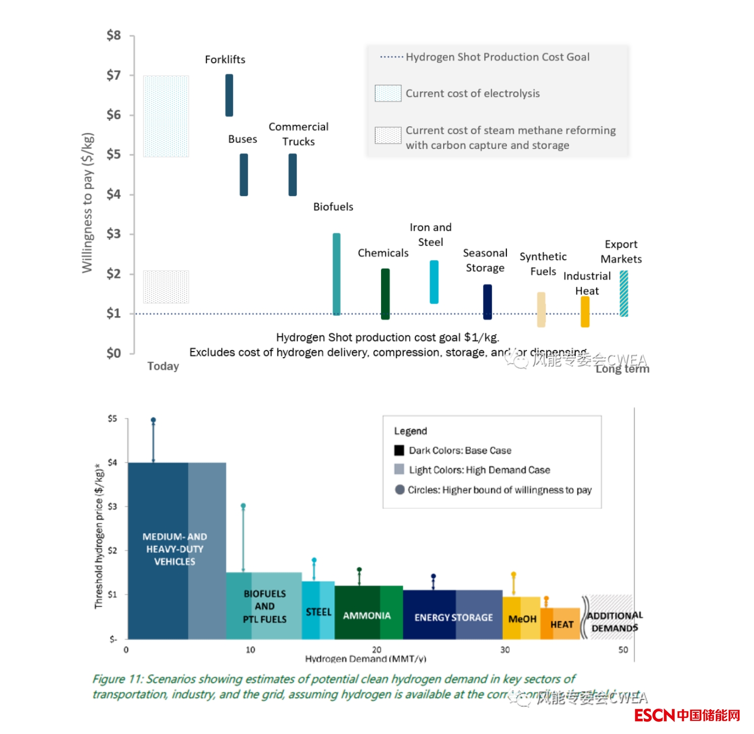 假設(shè)氫氣以相應(yīng)的閾值成本提供,上面幾種情景顯示了運(yùn)輸、工業(yè)和電網(wǎng)等關(guān)鍵部門潛在清潔氫需求的估計(jì)值。