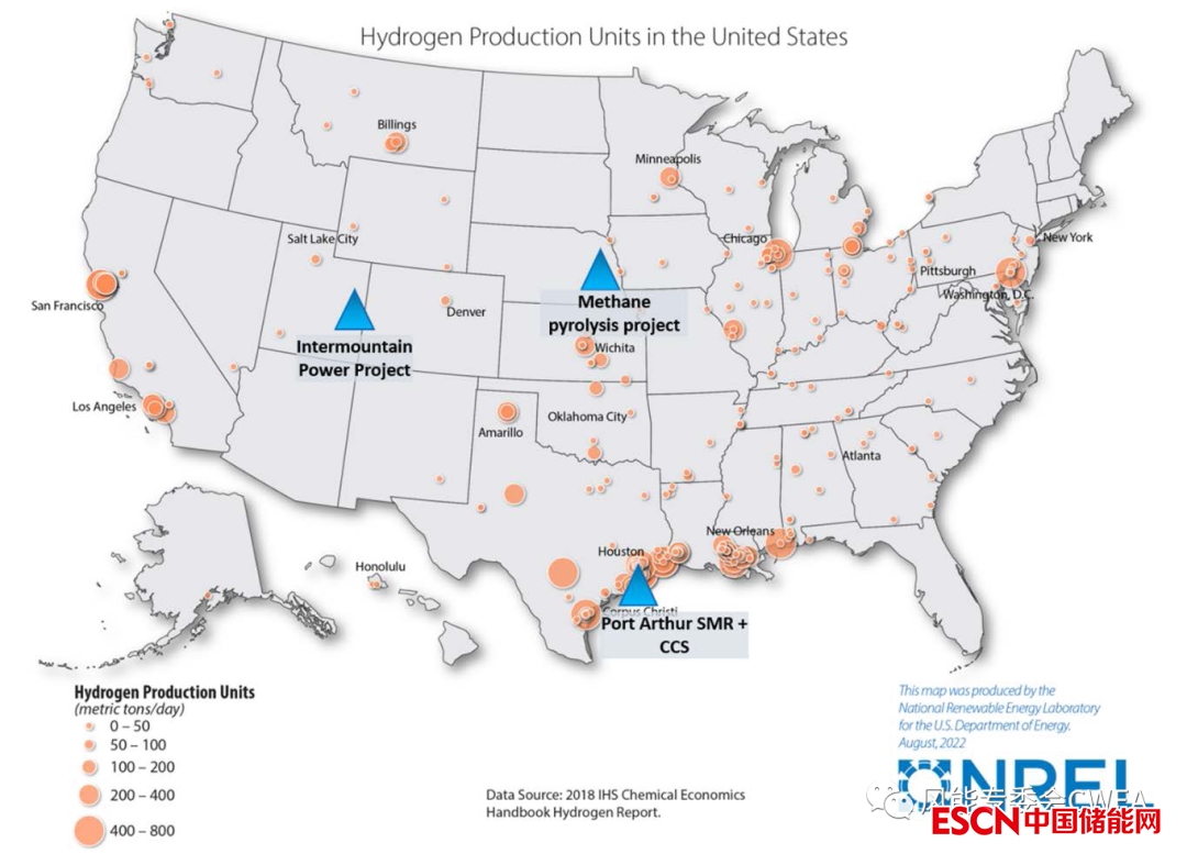 上2圖:美國(guó)制氫技術(shù)部署示例。生產(chǎn)能力規(guī)模由圓圈的大小近似表示