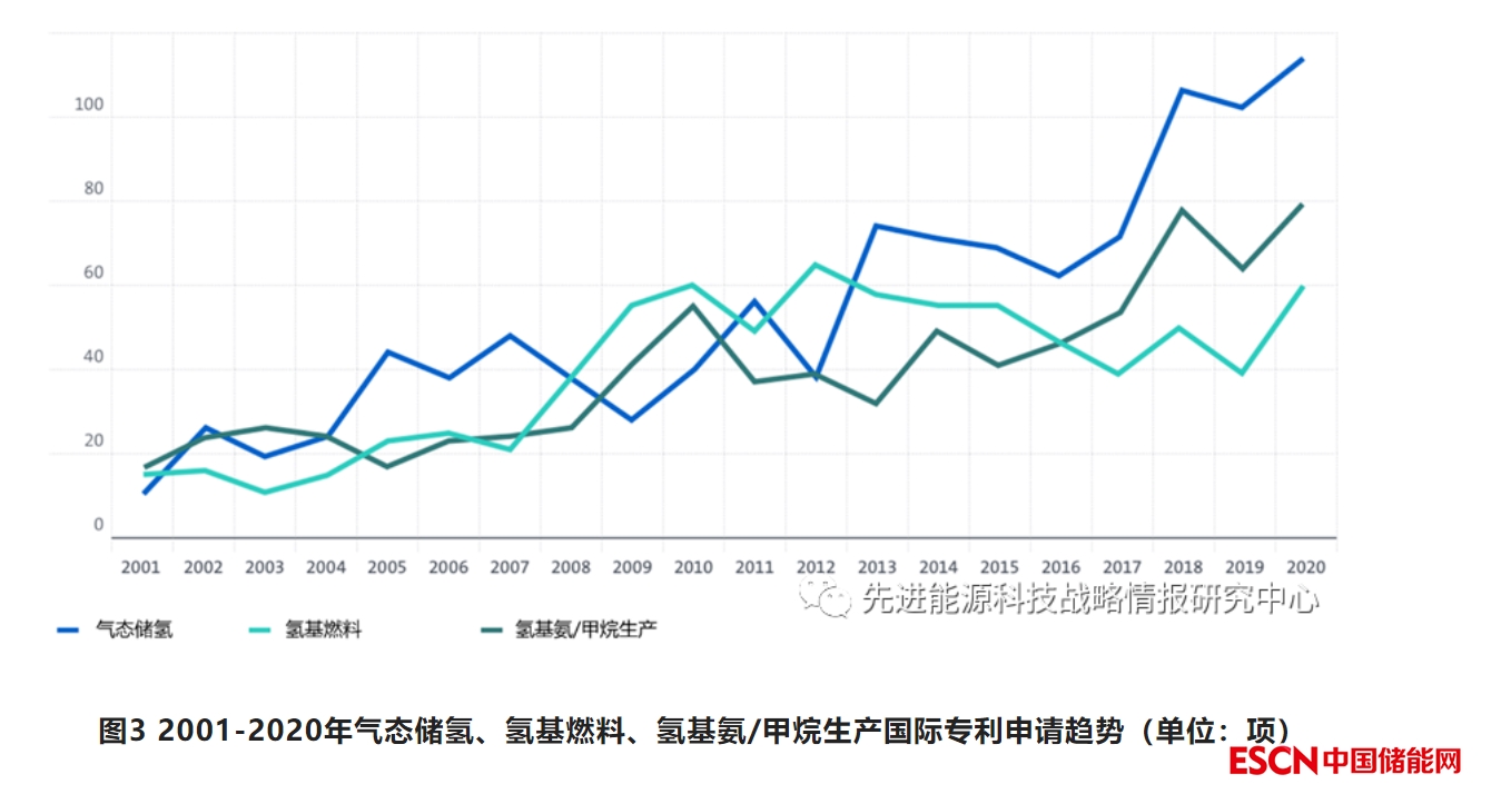 四、2001-2020年,現(xiàn)有儲氫技術(shù)改進及氫基氨/甲醇生產(chǎn)技術(shù)專利活動穩(wěn)步增長,但過去10年氫基燃料創(chuàng)新失去了動力