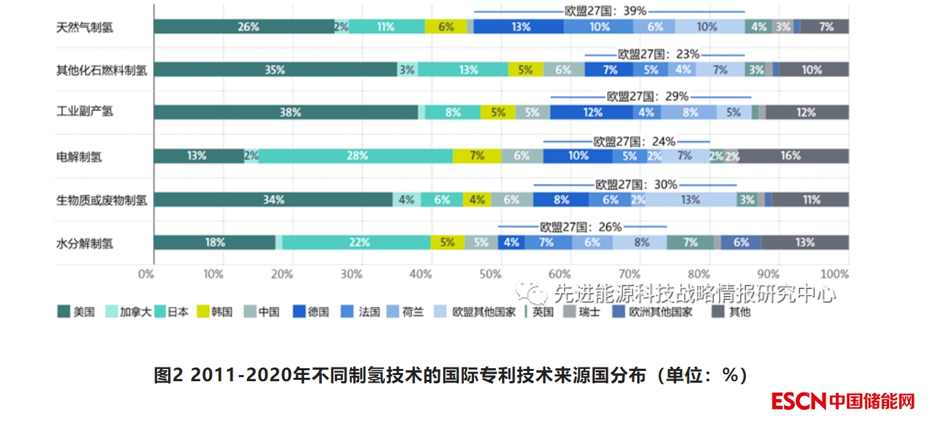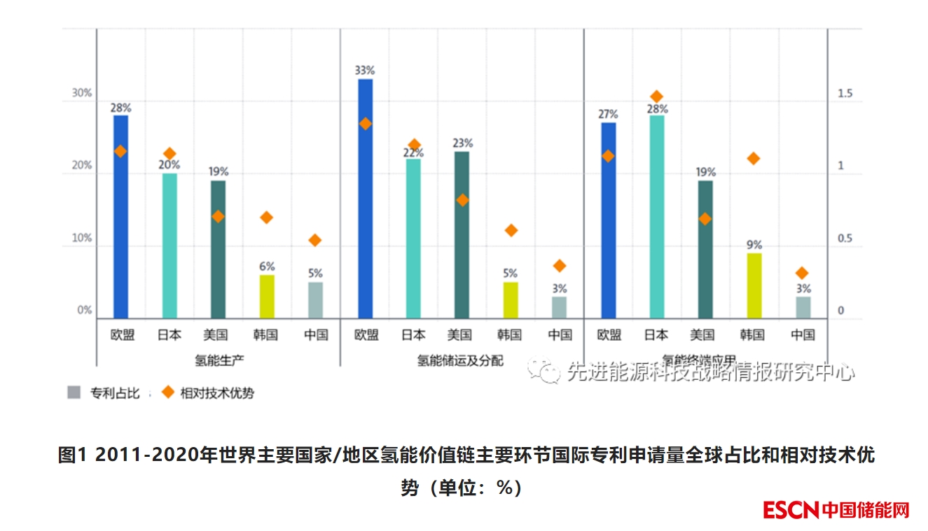 2011-2020年約一半的氫能國際專利與制氫相關(guān),其余分布在氫的存儲、分配、輸運和終端應(yīng)用等環(huán)節(jié)。約28%的氫能國際專利由歐洲國家申請,其在三大主要環(huán)節(jié)(氫能生產(chǎn)、儲運及分配、終端應(yīng)用)的相對技術(shù)優(yōu)勢(RTA)指數(shù)也領(lǐng)先于其他主要氫能創(chuàng)新國家(圖1)。日本也具有較強的氫能創(chuàng)新實力,貢獻了約24%的國際專利,且其增速快于歐洲,兩者的年均復(fù)合增長率分別為6.2%和4.5%。美國貢獻了20%的氫能國際專利,是主要氫能創(chuàng)新國家中唯一申請量下降的國家。韓國(7%)和中國(4%)國際專利申請數(shù)量有限但穩(wěn)步增長,年均復(fù)合增長率分別達到12.2%和15.2%。