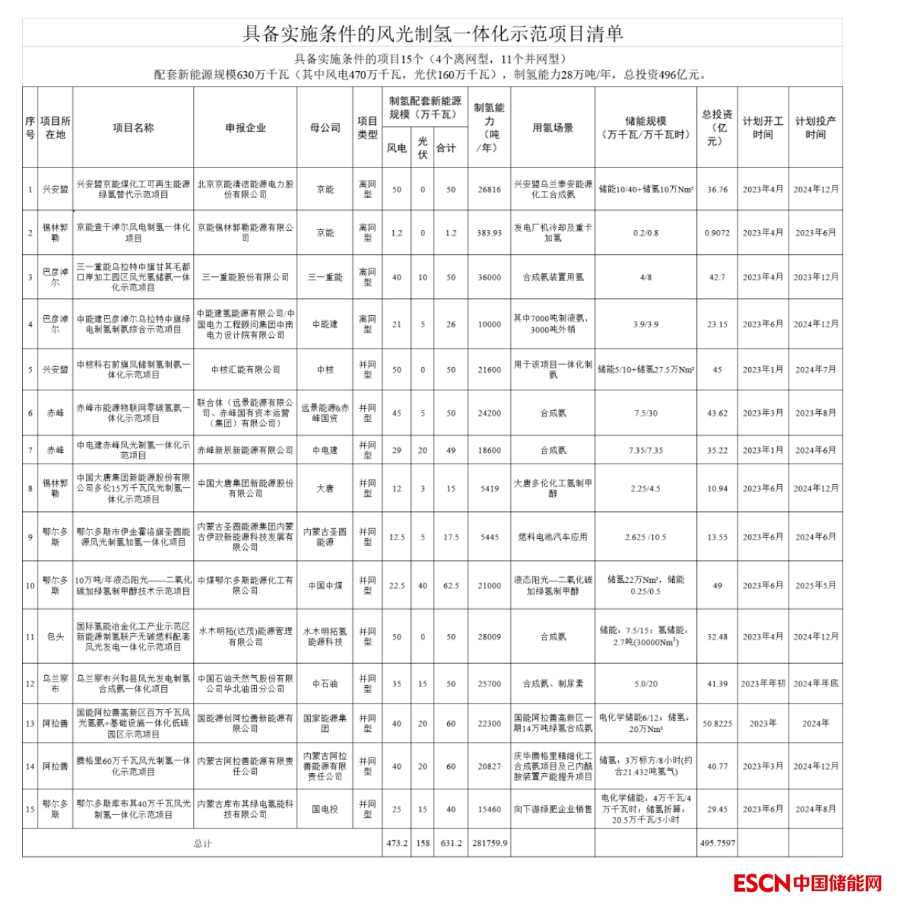 具備實(shí)施條件的項(xiàng)目15個(gè)(4個(gè)離網(wǎng)型,11個(gè)并網(wǎng)型),配套新能源規(guī)模631.2萬千瓦(其中風(fēng)電473.2萬千瓦,光伏158萬千瓦),制氫能力28.2萬噸/年,總投資495.8億元(詳見附件)。