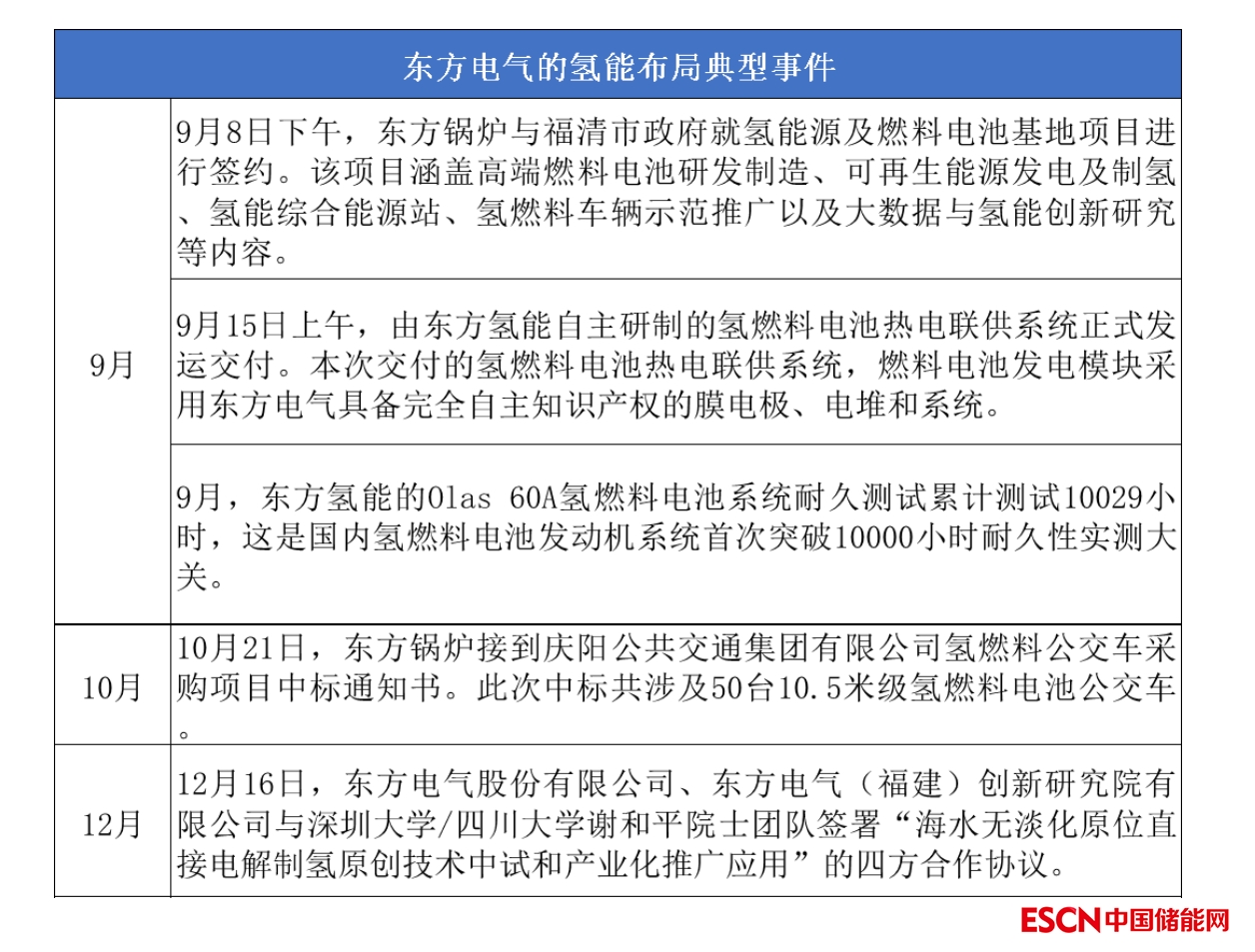 作為央企,東方電氣從2010年就開始布局氫能,經(jīng)過十多年的努力,已掌握了燃料電池關(guān)鍵核心技術(shù),形成了氫制取、氫儲(chǔ)存、氫加注、氫使用全產(chǎn)業(yè)鏈整體解決方案的供應(yīng)能力。東方氫能與東方鍋爐是集團(tuán)運(yùn)營(yíng)氫能業(yè)務(wù)的兩大主體,合力支撐東方電氣的氫能戰(zhàn)略發(fā)展。近期布局事件如下: