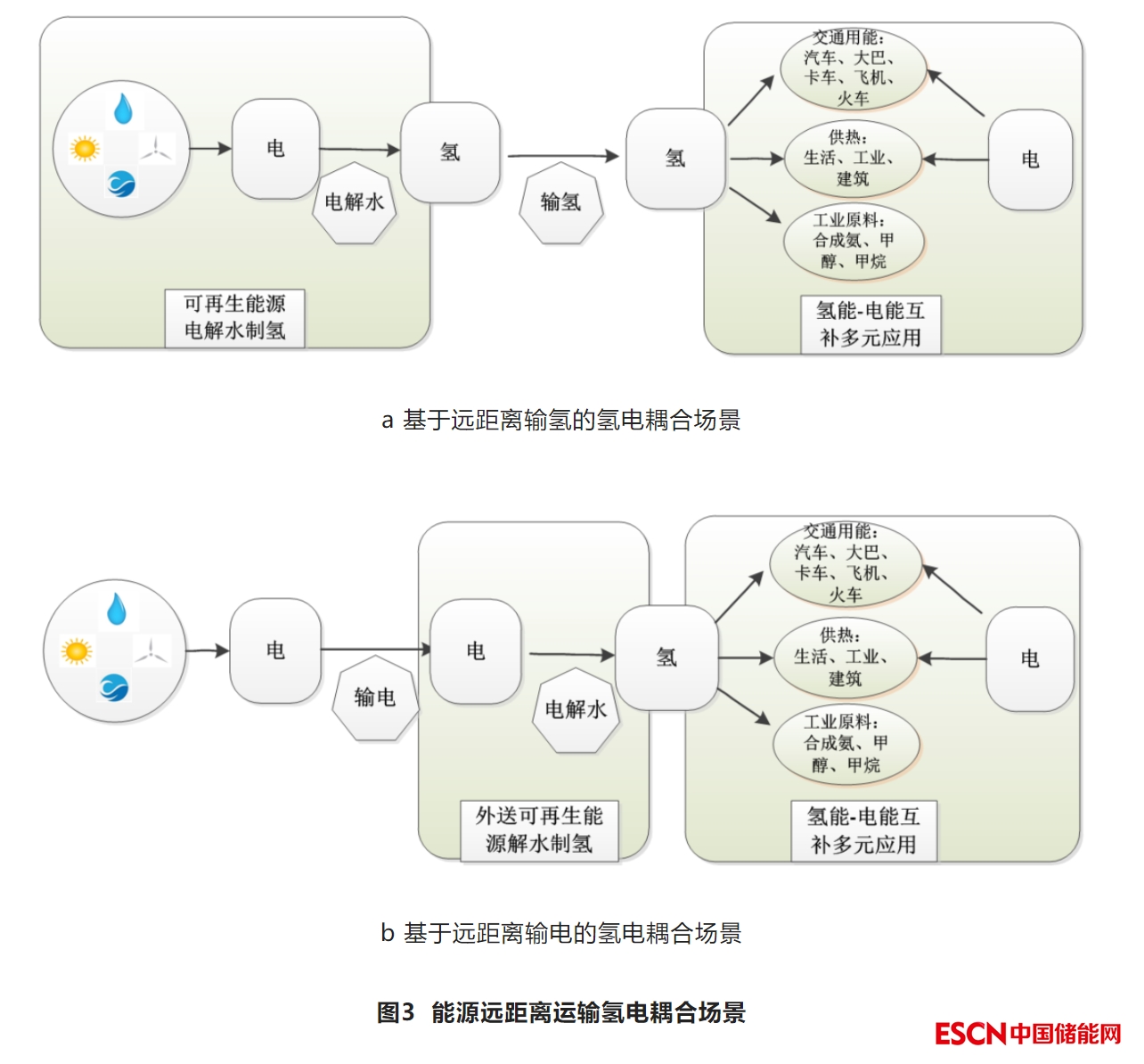 典型場(chǎng)景三為能源遠(yuǎn)距離運(yùn)輸耦合場(chǎng)景,即針對(duì)可再生能源豐富地區(qū)和氫能需求端逆向分布,綜合論證輸電與輸氫的技術(shù)經(jīng)濟(jì)性,實(shí)現(xiàn)新能源發(fā)電與氫能需求匹配的場(chǎng)景,既包括在可再生能源資源豐富地區(qū)設(shè)立制氫專區(qū),采用氫能輸運(yùn)技術(shù),滿足遠(yuǎn)端用戶側(cè)用氫需求的場(chǎng)景(見圖3a);也包括將可再生能源發(fā)電遠(yuǎn)距離輸?shù)接脩魝?cè),通過用戶側(cè)電解水制氫,滿足遠(yuǎn)端用戶側(cè)多元化用氫和用電等能源需求(見圖3b)。